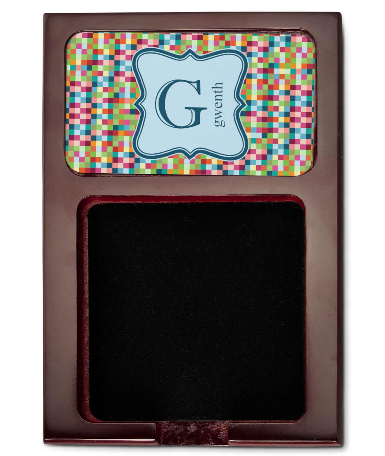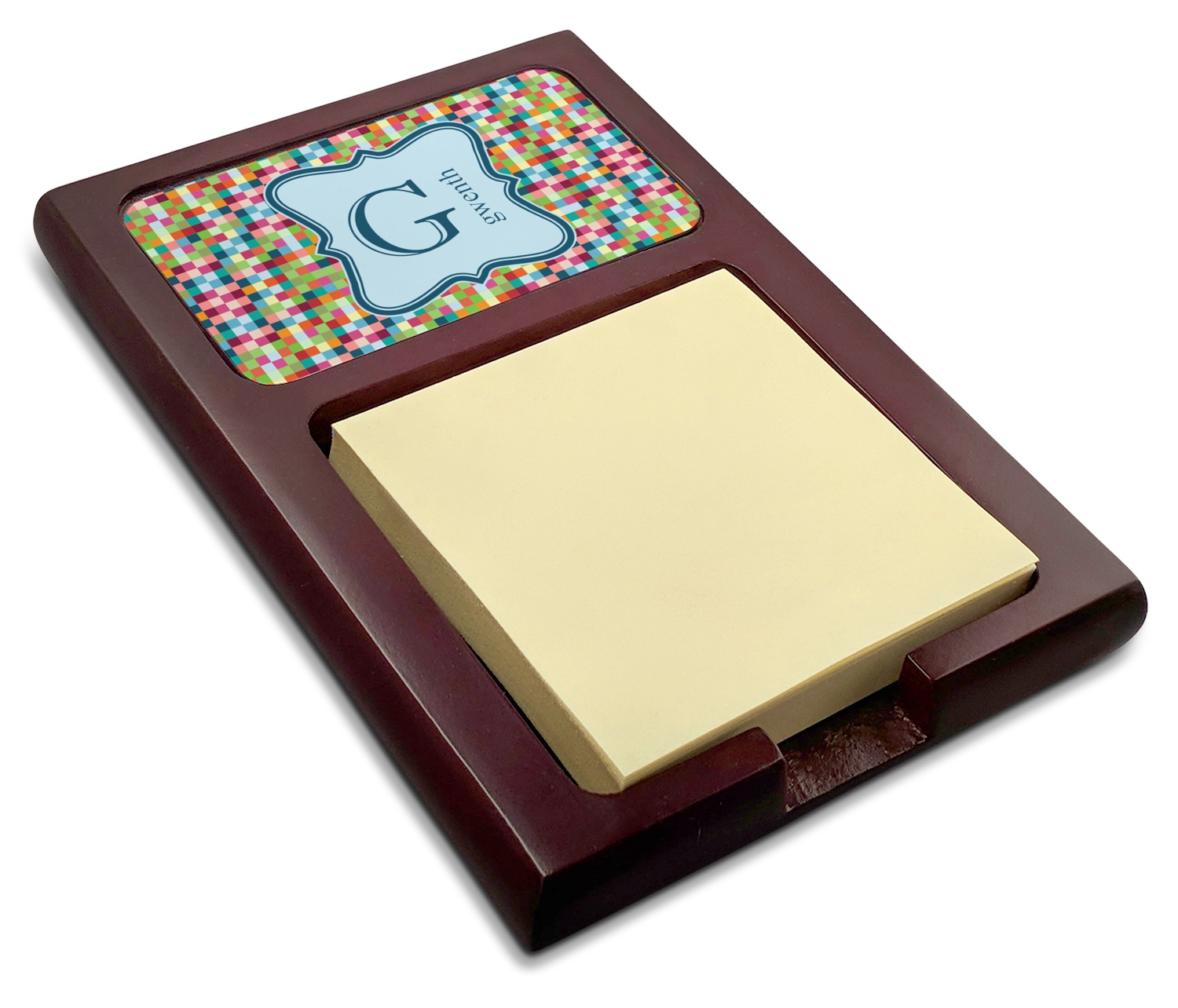 Crafted from a fine mahogany, this post it note holder is in the shade of a dark, cherry color. The dispenser itself is about 4.25 by 6.25 by 0.75 inches. You can place your 3 by 3 inch sticky notes in the indentation below the nameplate. We print your customization onto the nameplate that rests above the velvety indentation.