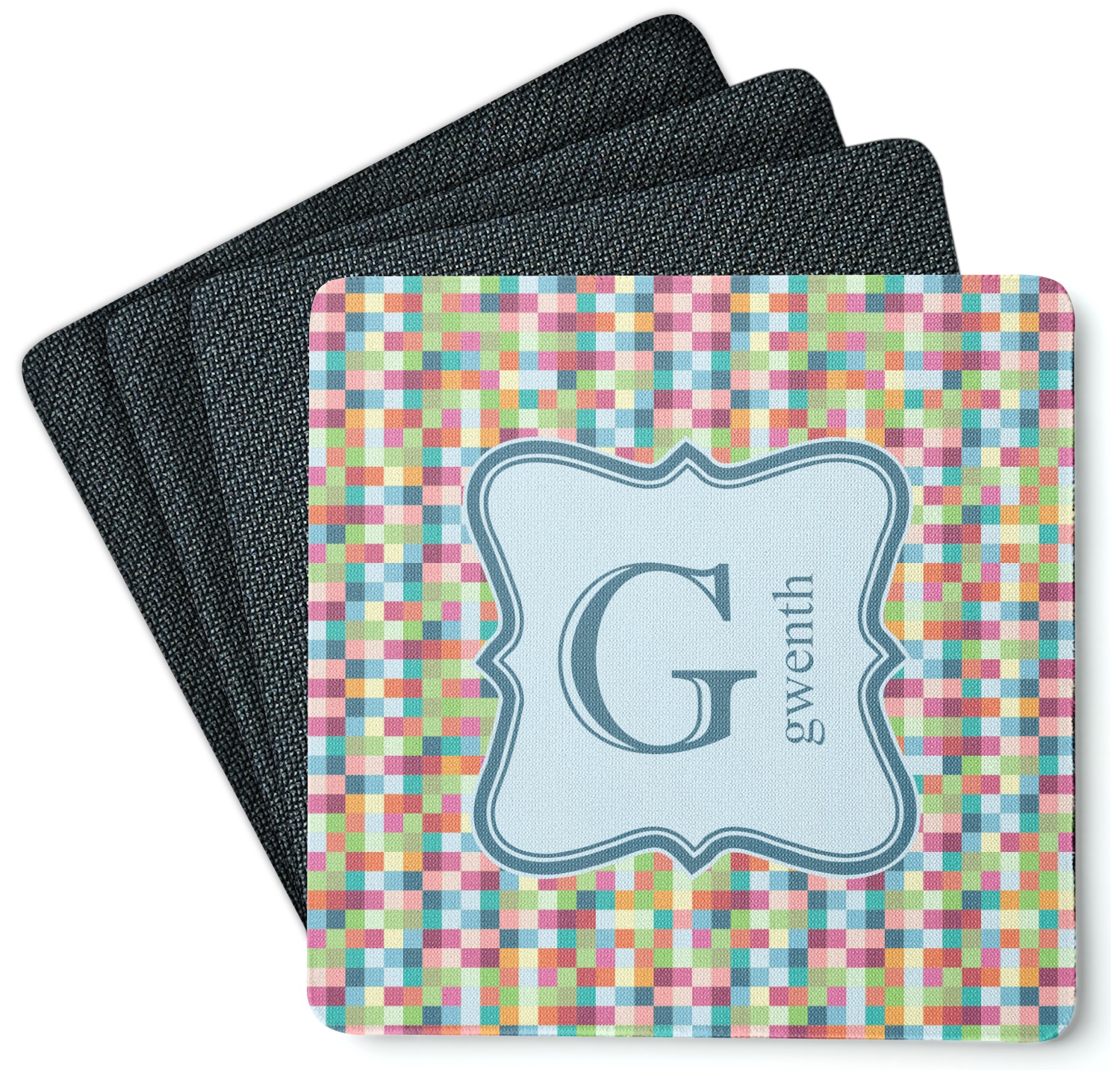 These drink coasters have a smooth, polyester top and a textured, rubber backing on its bottom. The non-slip rubber backing underneath works to keep any spills at bay. At 4 by 4 by 0.25 inches thick, these custom coasters are a suitable size for most drinkware. Your personalization is displayed atop the face of the cup coaster. We sell these rubber coasters in two different shapes: square and round. You can buy each shape as singulars or as a set of 4.