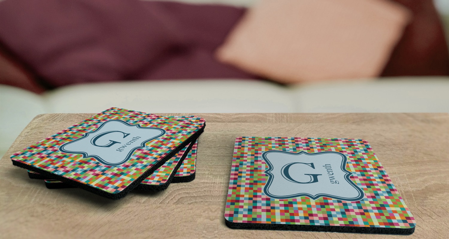 Replace your boring, run-of-the-mill coasters with a set of 4 personalized coasters! When personalized, these coasters will protect your beloved surfaces while adding to your home's decor! Thanks to your coasters bright colors and unique design, your guests will be eager to use them!