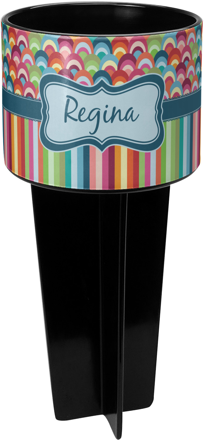 This cup holder has a large stake at its bottom that anchors it to the sand or ground below, while the cup holder rests above the stake. The entire drink holder is made of durable plastic and displays your customization around the cup holder portion. We sell these personalized beach spikers in two different colors: black and white.