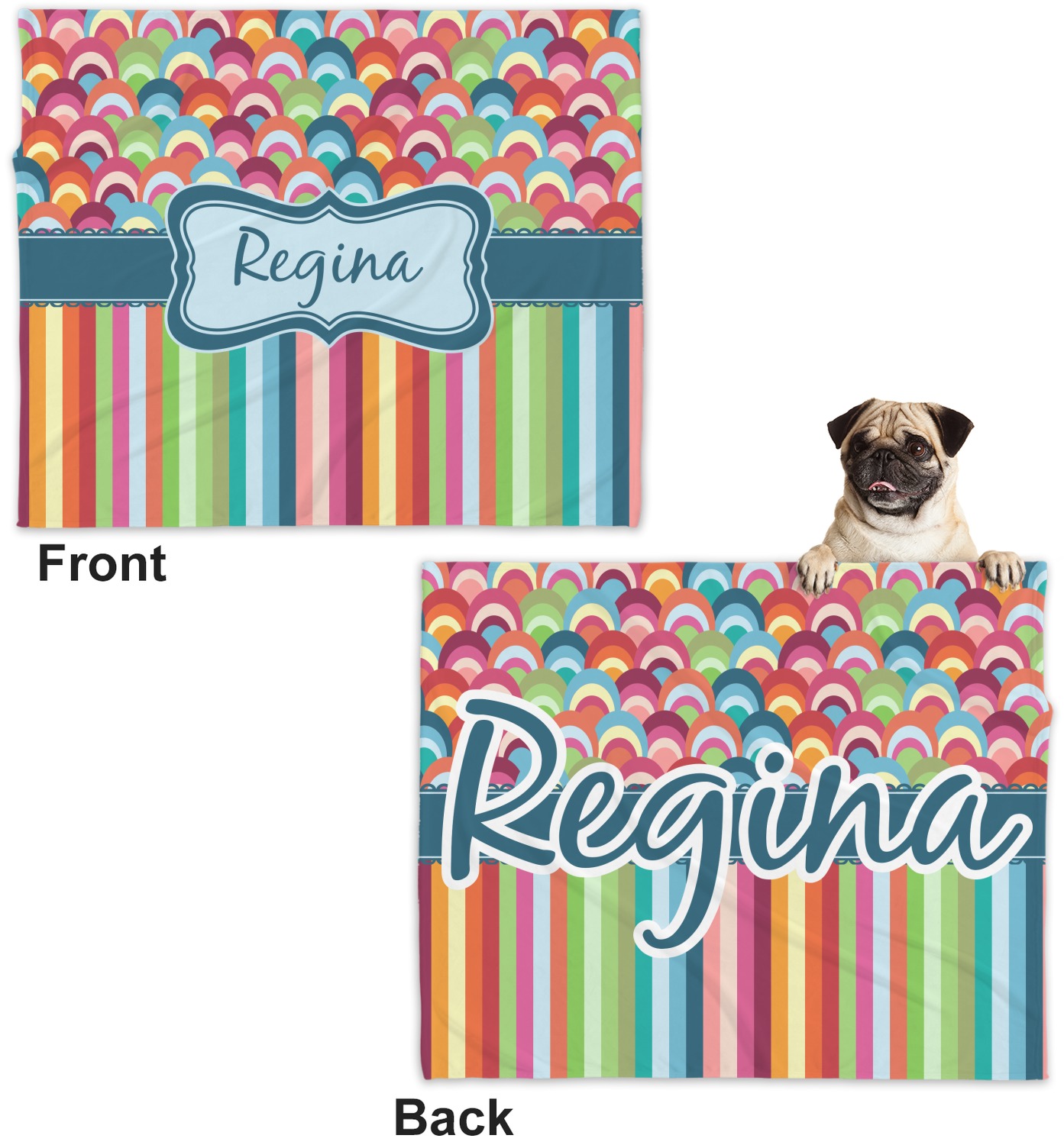 These dog blankets are crafted from a gentle, soft-to-the-touch, minky material. We print your customizations, either matching or differing, on both the top and underside of the blanket. These personalized dog blankets are available in two sizes: regular and large. Our regular size, at 40" x 30", accommodates small and some medium size dogs. At 60" x 50", our large dog blanket is a better fit for bigger breeds. Though specialized for dogs, these blankets still make a thoughtful gift for your favorite feline, or any other pet in mind!