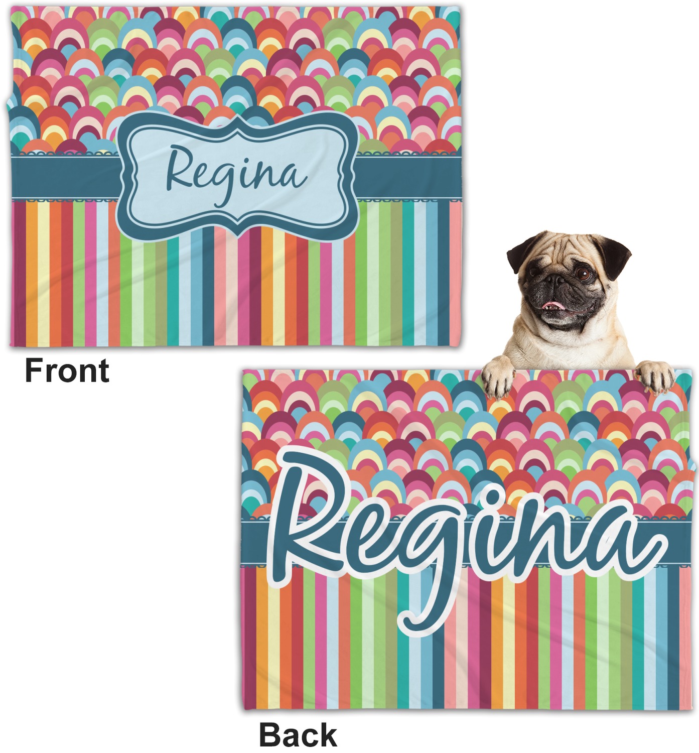 These dog blankets are crafted from a gentle, soft-to-the-touch, minky material. We print your customizations, either matching or differing, on both the top and underside of the blanket. These personalized dog blankets are available in two sizes: regular and large. Our regular size, at 40" x 30", accommodates small and some medium size dogs. At 60" x 50", our large dog blanket is a better fit for bigger breeds. Though specialized for dogs, these blankets still make a thoughtful gift for your favorite feline, or any other pet in mind!