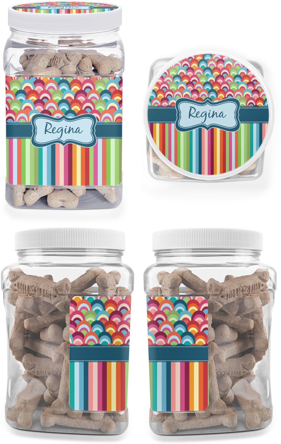 This half gallon jar, made from a sturdy plastic, is the perfect way to keep treats from any naughty pet paws, while still keeping them ready on hand for when your pup performs an impressive trick. This dog cookie jar features a screw-on, white lid that displays your personalized design on a vinyl sticker. We apply another customized sticker that wraps around the front and sides of the jar. Our dog treat jar also has indentations on the rear ends of the sides, which allows for convenient handling, and its square frame allows for easy storage.
