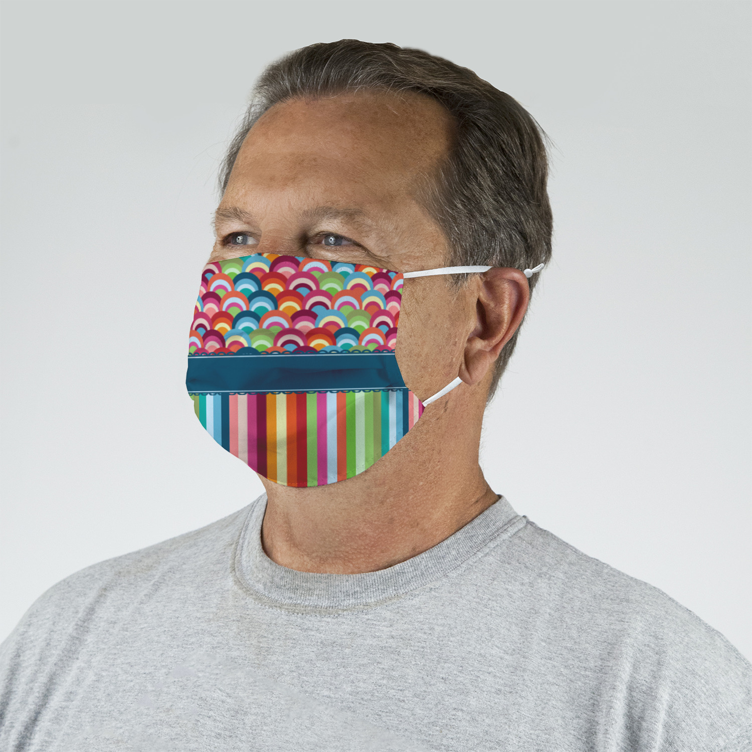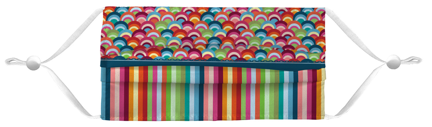 These fun face masks are 7" wide and 3.5" high. They feature pleats, adjustable ear loops, and are made with two layers of fabric. The top layer where your design is printed is a breathable polyester sheeting, while the inside layer is a soft microfiber polyester