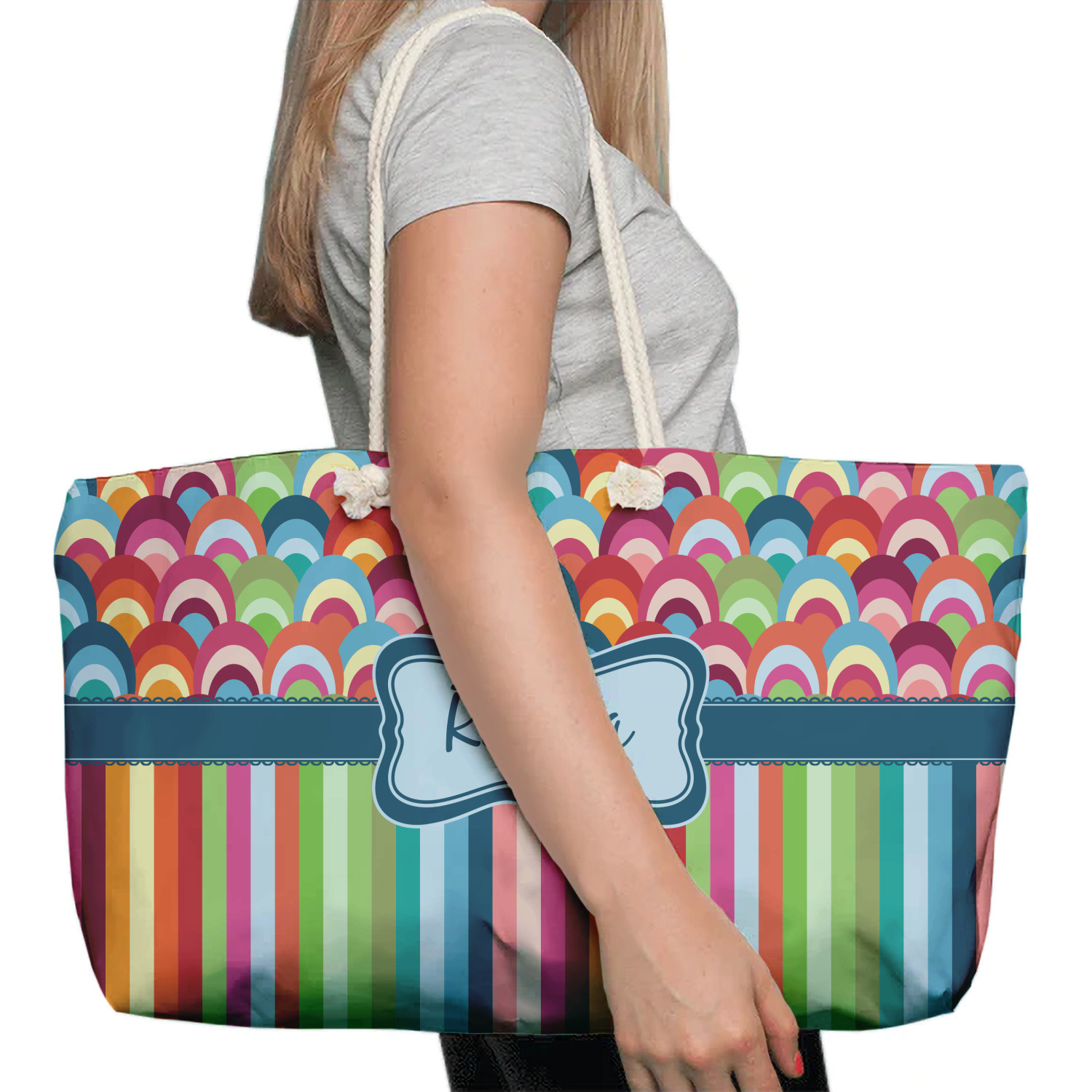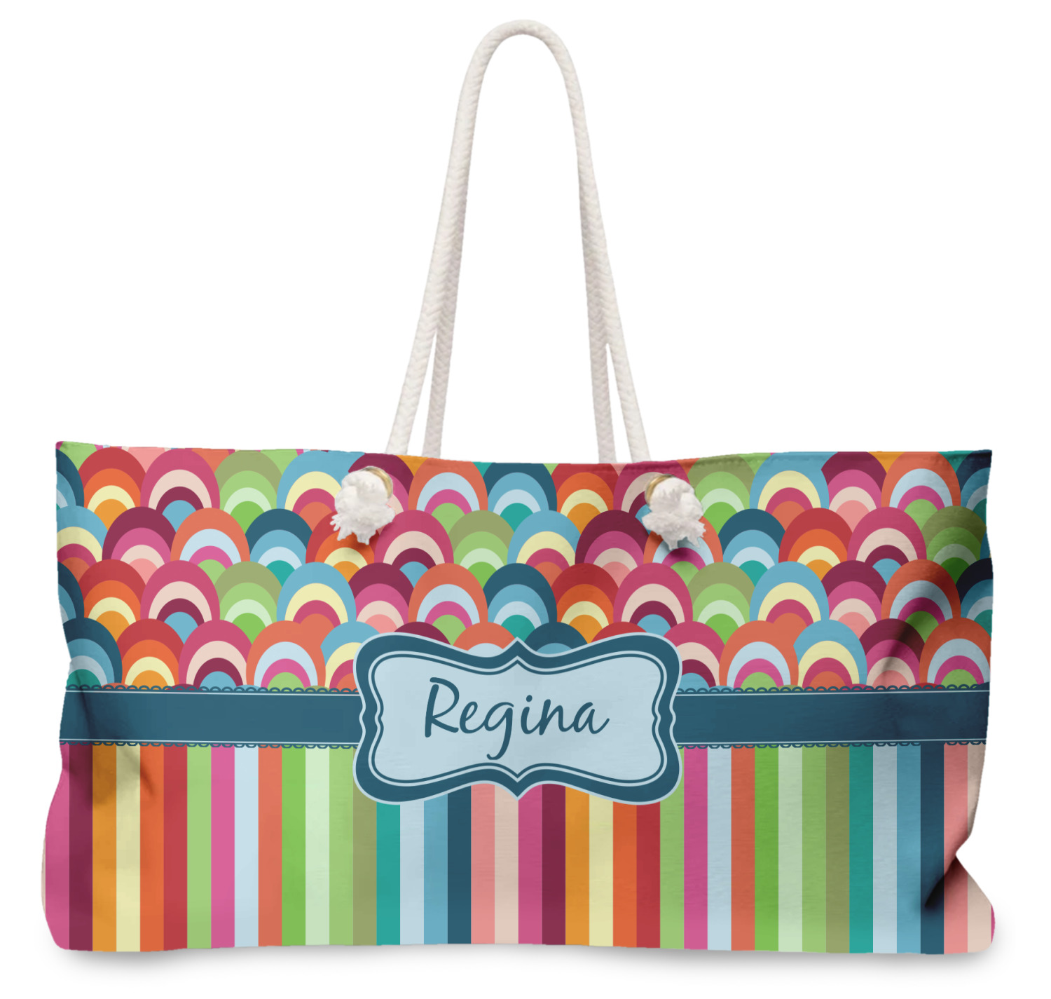 Our oversized weekender tote with rope handles is perfect for your weekend at the beach or on the town. This large tote are 24" W X 13" H, with a 5" gusset and a 27" thick rope handles with a knot that is put through a grommeted brass hole.
