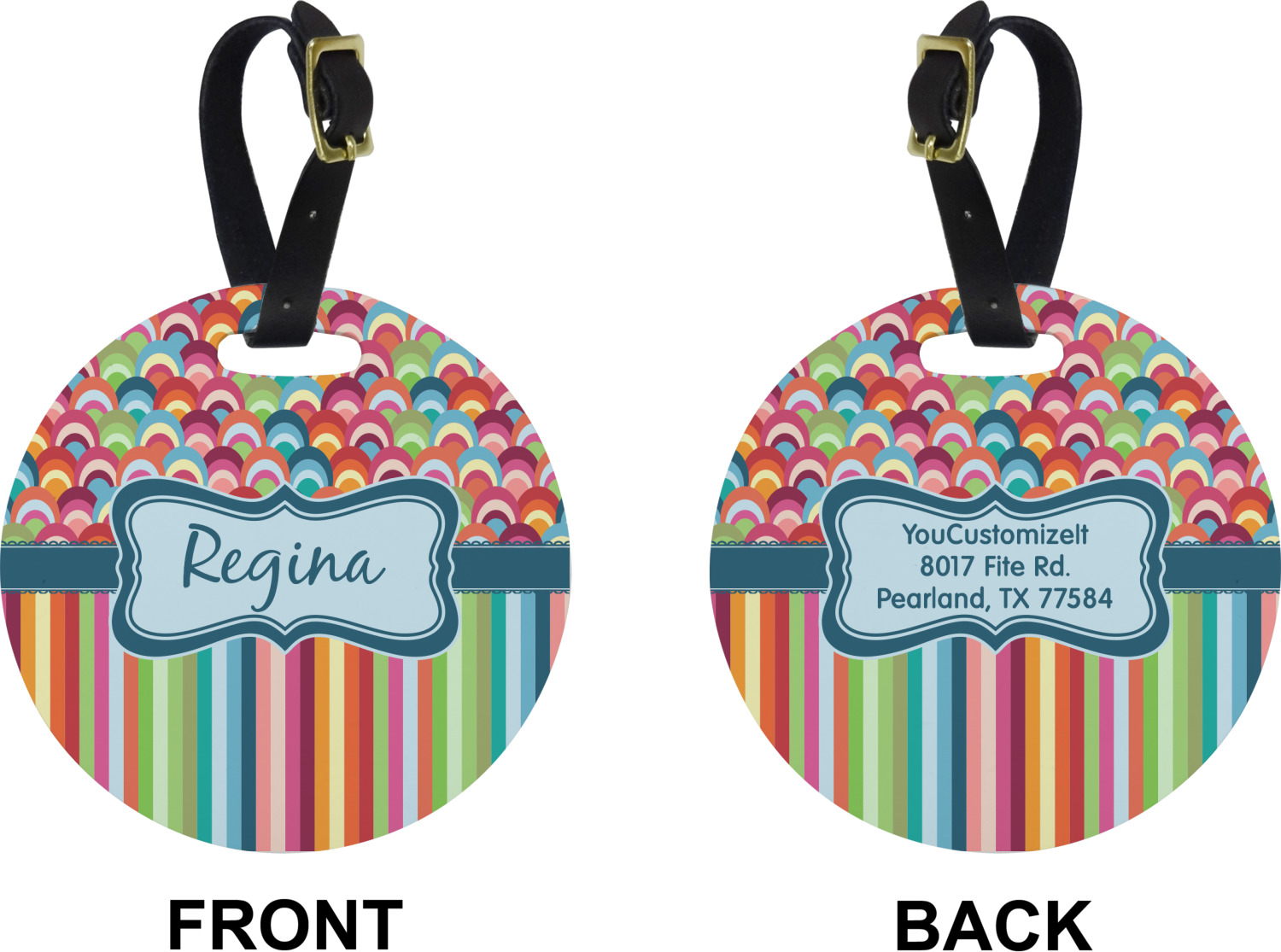 These personalized bag tags are sold in a variety of shapes, so that you may find the product that meets your vision exactly. We sell a round luggage tag, which measures at approximately 4" x 4". Our square luggage tag is about 3.5" x 3.5", while our rectangular version is 2.75" x 4 ".