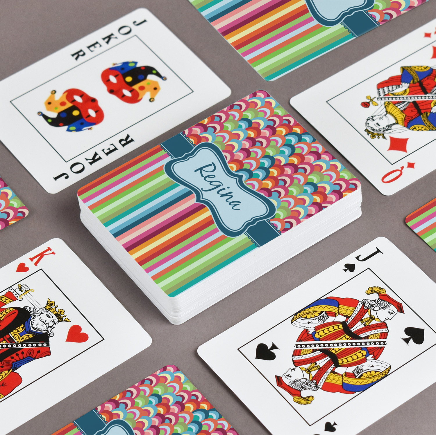 Here at YouCustomizeIt, you can customize your playing cards by uploading your own design, photo, or logo. We have design templates that you can customize by changing the patterns, colors, graphics, personalization styles, etc. - using our free for you to use in our design elements library.