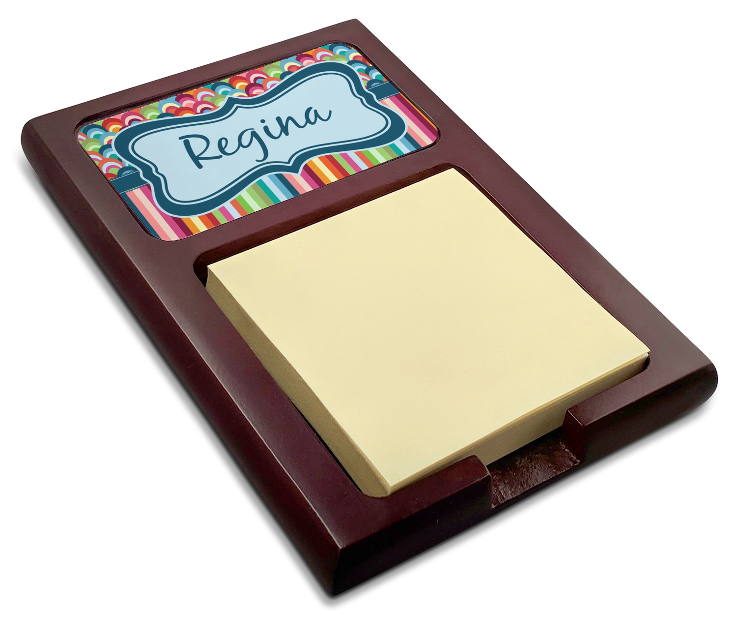 Crafted from a fine mahogany, this post it note holder is in the shade of a dark, cherry color. The dispenser itself is about 4.25 by 6.25 by 0.75 inches. You can place your 3 by 3 inch sticky notes in the indentation below the nameplate. We print your customization onto the nameplate that rests above the velvety indentation.