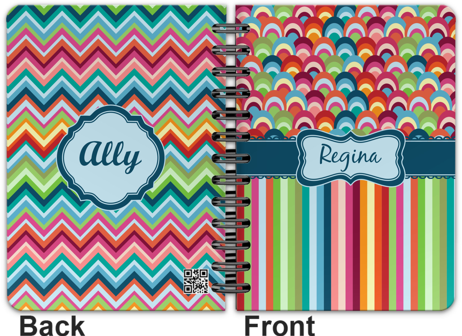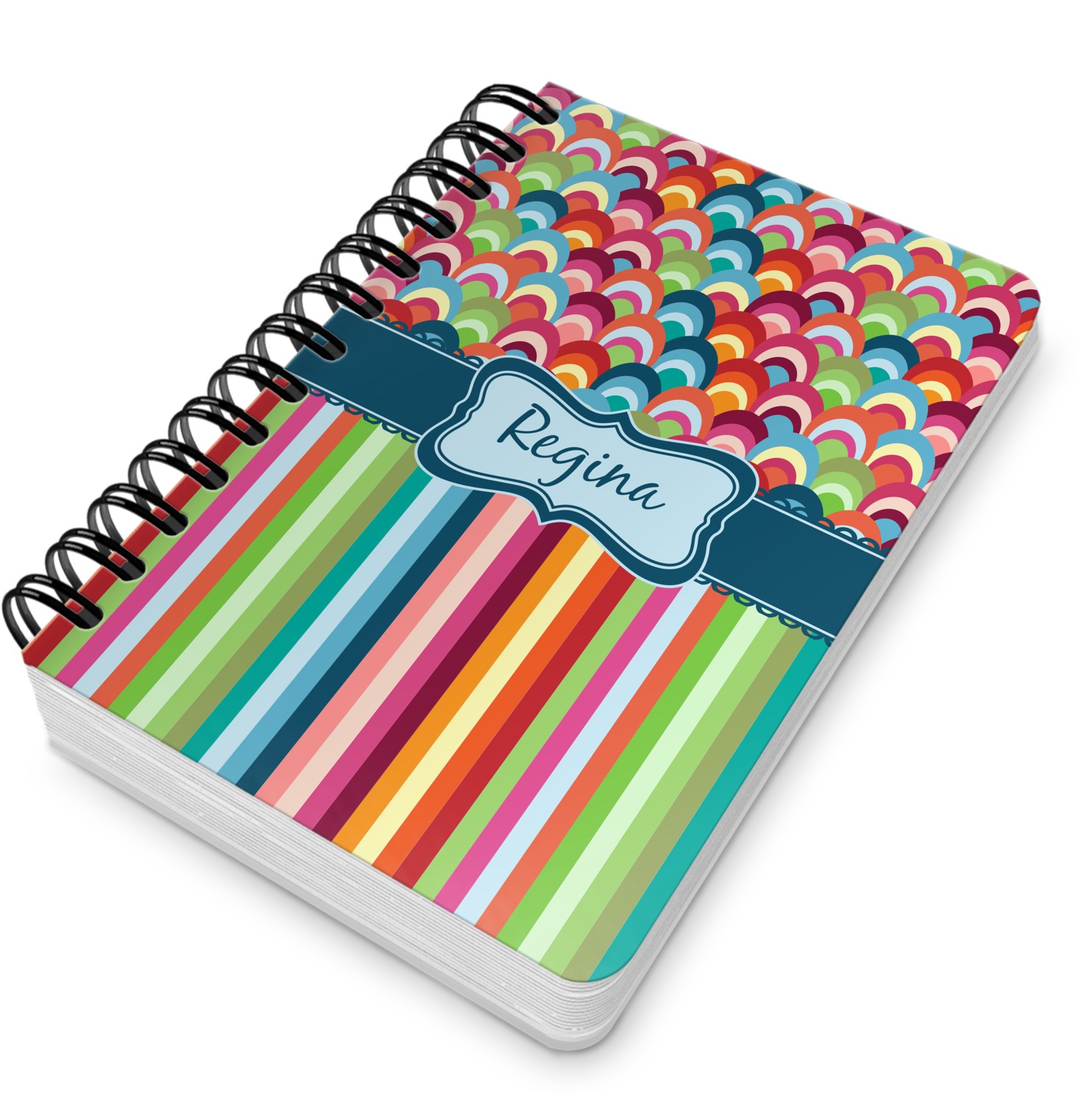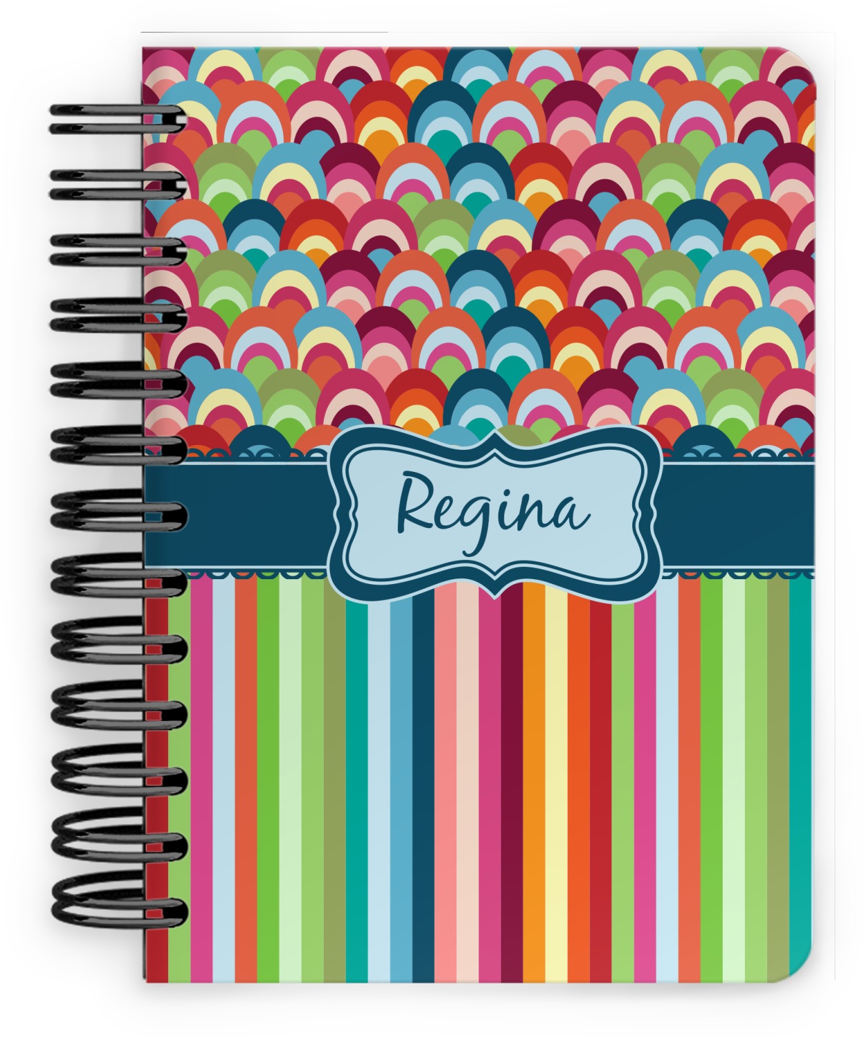 This spiral notebook includes 75 sheets of thick, ruled paper. The front and back of this custom notebook is made of a robust, laminate, plastic covering. We print your personalization on these two panels, underneath a glossy finish, which emphasizes the colors of your design. The two panels and the sheets of paper are held together by a sturdy, black coil. The paper within your bound notebook is perforated for easy, clean tearing.