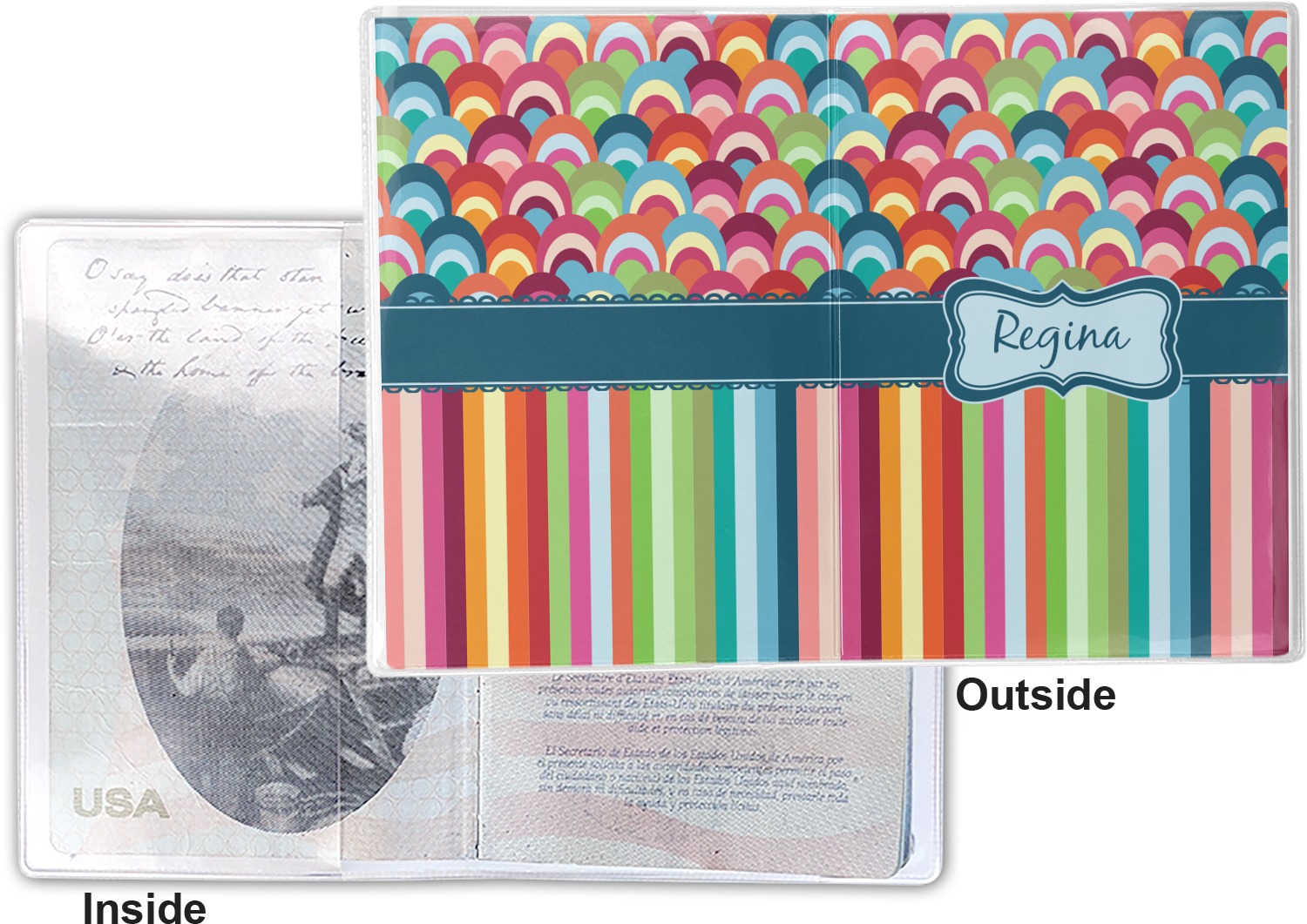 This cover is made of a sturdy clear vinyl with a personalized vinyl insert inside. There is a large and a small pocket on either side to hold the covers of your passport easily and firmly. The passport holder is approximately 7.5" x 5.25", the perfect size to snugly fit your passport. This slim cover is the perfect way to protect your passport without being one more bulky item you have to carry.