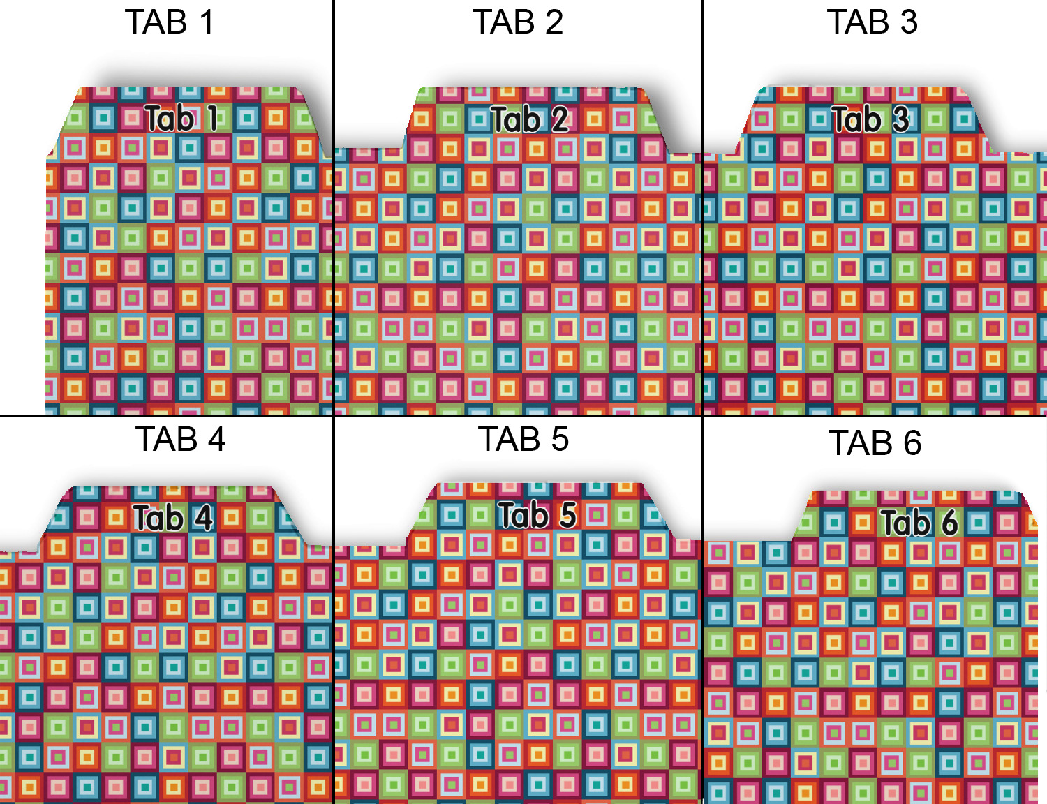 Whether you use binders at school or at work, we have designs to suit all of them. Available in 5 or 6 tab sets, you are sure to find a set to suit your needs. The back of each one is white and can be used to take notes, write vital information on, etc.