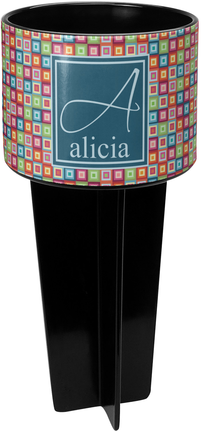 This cup holder has a large stake at its bottom that anchors it to the sand or ground below, while the cup holder rests above the stake. The entire drink holder is made of durable plastic and displays your customization around the cup holder portion. We sell these personalized beach spikers in two different colors: black and white.