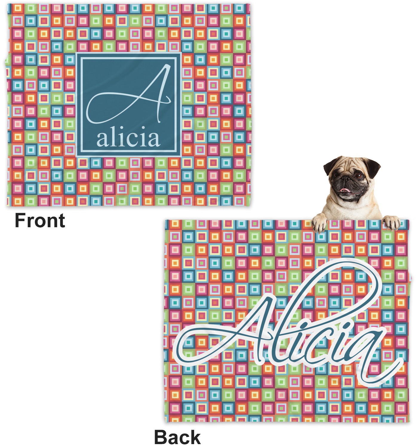 These dog blankets are crafted from a gentle, soft-to-the-touch, minky material. We print your customizations, either matching or differing, on both the top and underside of the blanket. These personalized dog blankets are available in two sizes: regular and large. Our regular size, at 40" x 30", accommodates small and some medium size dogs. At 60" x 50", our large dog blanket is a better fit for bigger breeds. Though specialized for dogs, these blankets still make a thoughtful gift for your favorite feline, or any other pet in mind!