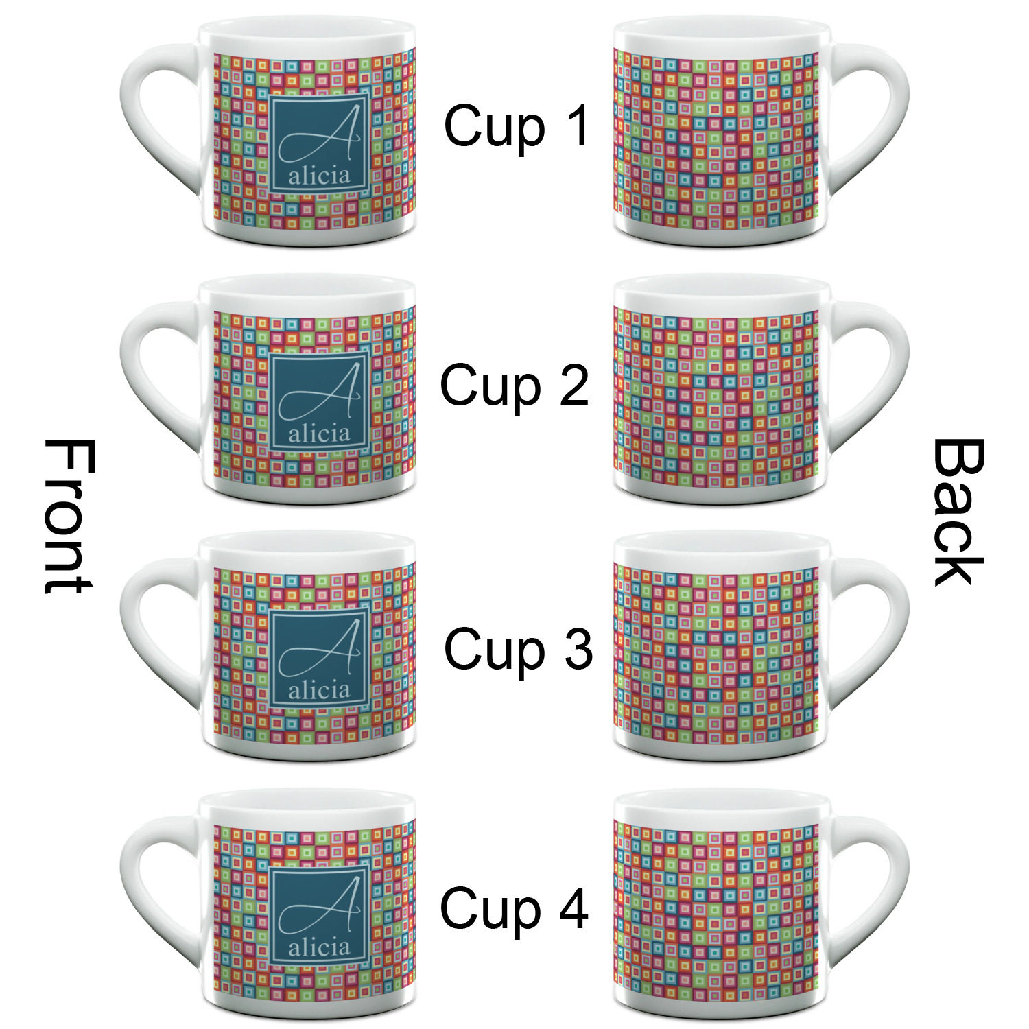Each of our espresso mugs is a ceramic material sure to keep your drink warm. Personalize one cup for yourself, or order a set of 4! Its the perfect little gift for any coffee lover! We carry two sizes for you to personalize - 3 oz. (approx. 3.25" x 2.325" x 2.625") or 6 oz. (approx. 4" x 2.9" x 2.9"). Our 3 oz. mug is perfect for that single shot espresso while our 6 oz. mug can be your next favorite cappuccino cup holding two shots of espresso!