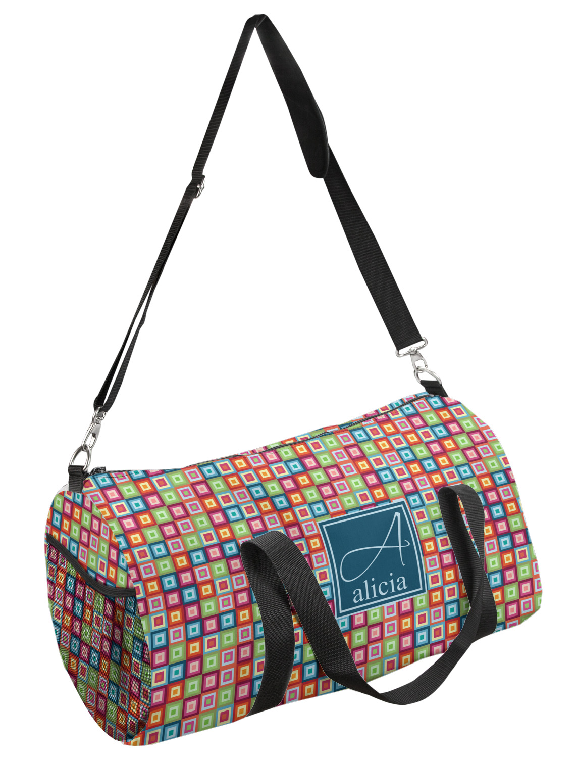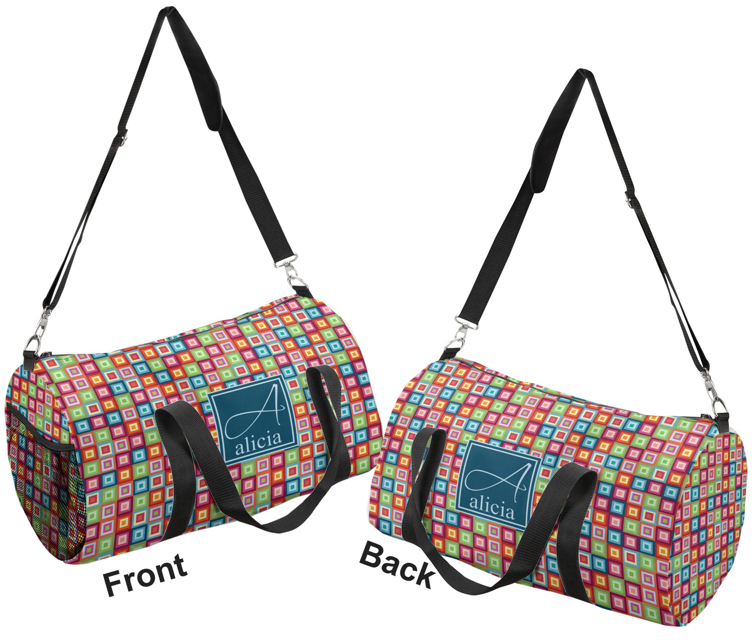 This duffle is a sturdy bag made of a canvas material. It comes in two sizes: Small (19"W x 9.5"H x 9.5"D) and Large (23"W x 12"H x 12"D). The bag is a cylindrical shape with a black adjustable strap and two handles. On one side is an elastic pouch to put a waterbottle or other small item. Your product will be sublimated with your design and is able to be designed on the front, back, and sides. Be sure to remember that the straps may cut into parts of your design if you upload your own artwork.
