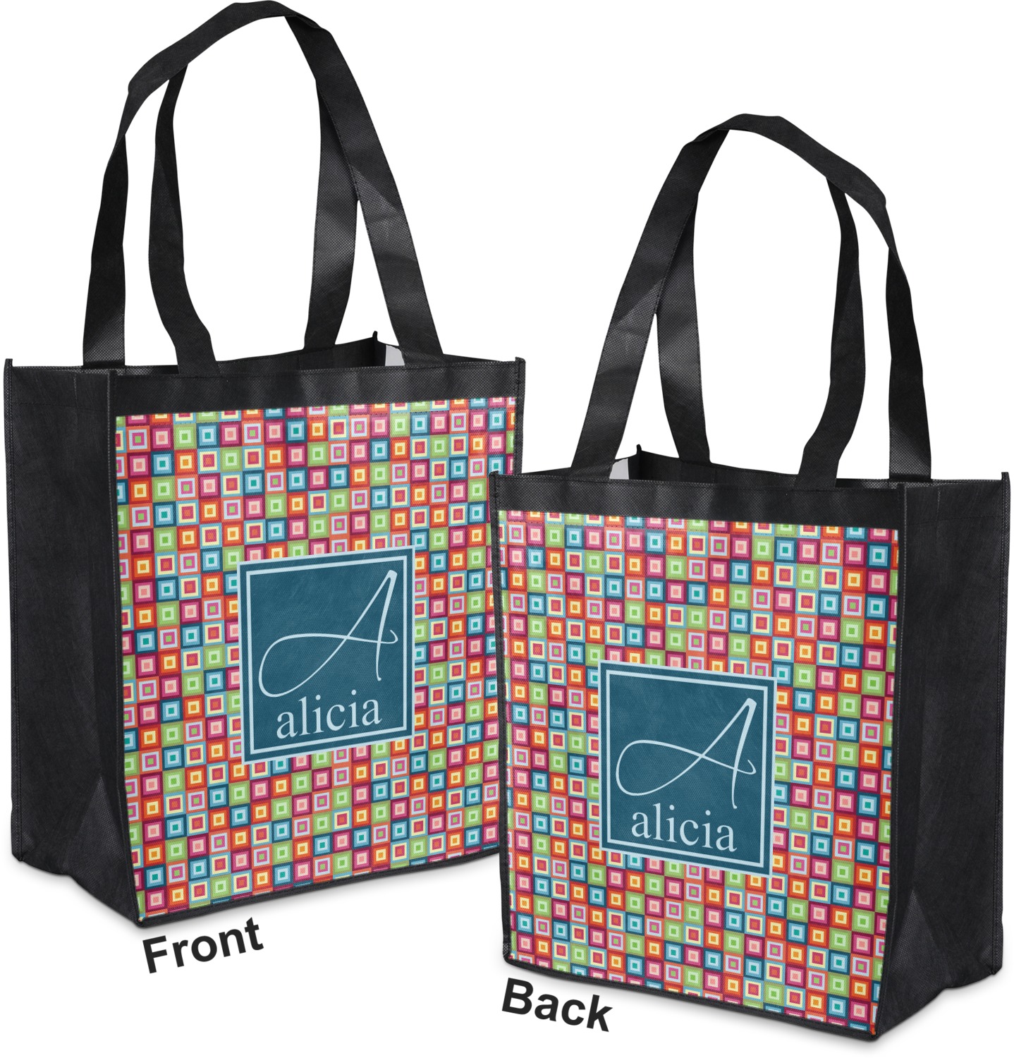Made from a durable, biodegradable material, these reusable shopping bags can support up to 30 pounds of weight. With two large handles, measuring at 8.5 inches each, these personalized tote bags are easy to carry to your vehicle or home. The bag itself is 12 by 13.5 inches, and can expand to a depth of 7 inches. Your customization is printed on both the front and back, while the remaining sides, trim, and handle are a sleek, charcoal black.