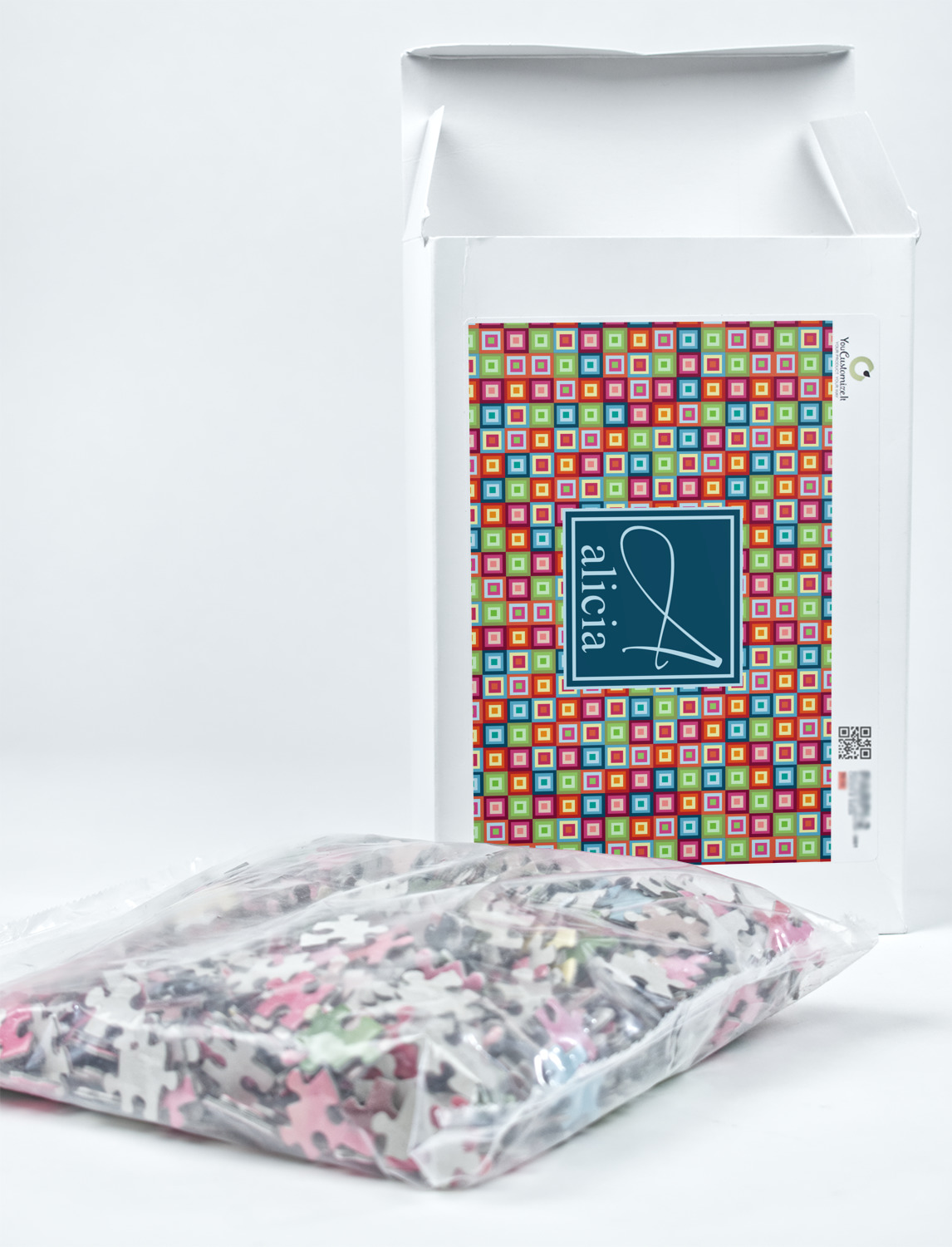 You can also upload your logo or art that you or your kids drew. To create more challenging jigsaw puzzles, you can create a pattern from with your logo or artwork. You can also add other elements such as text or personalization.