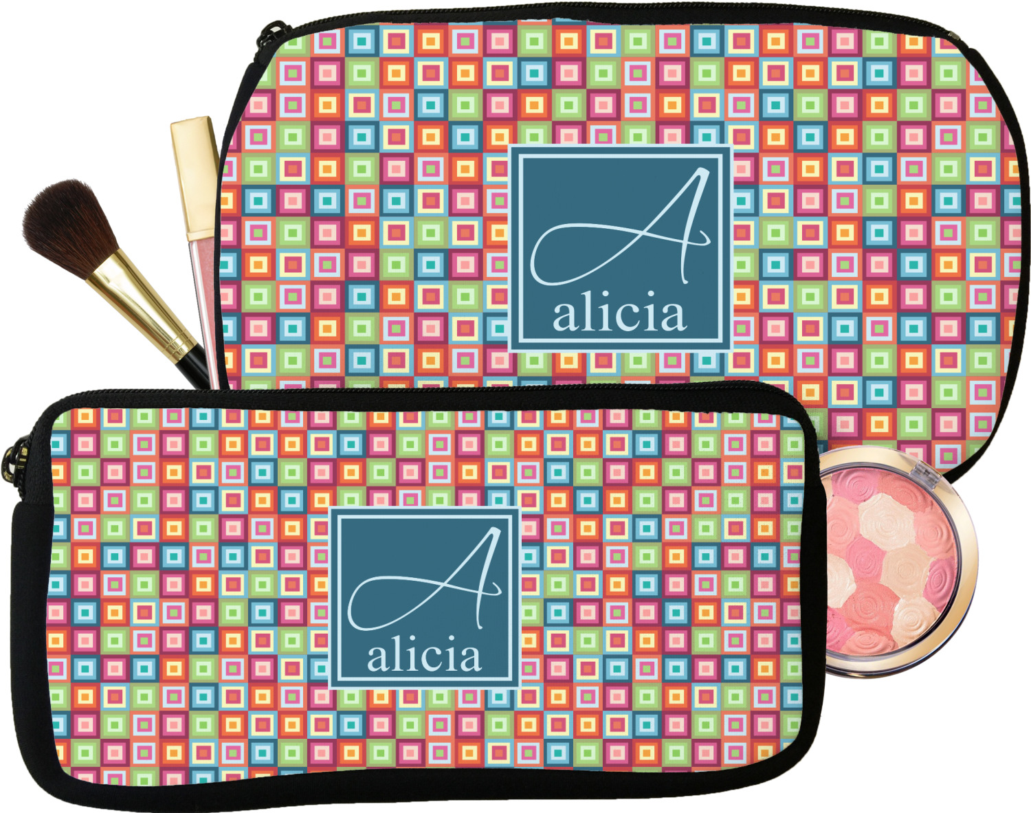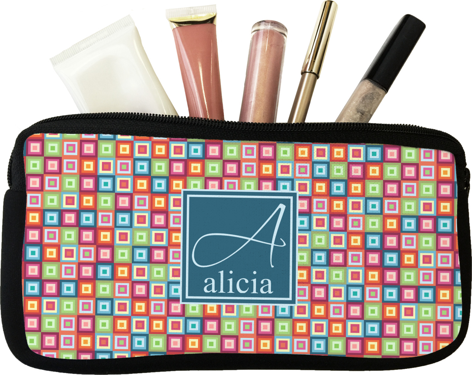 Our personalized makeup bags are available in many different designs, patterns and colors - so you are sure to find one that will love. They are made of neoprene (same material as wet-suits) and thus are water resistant, so spillages in your makeup bag will not end up all over you purse. They are customized on one side and are black on the other side and the zipper is black as well.
