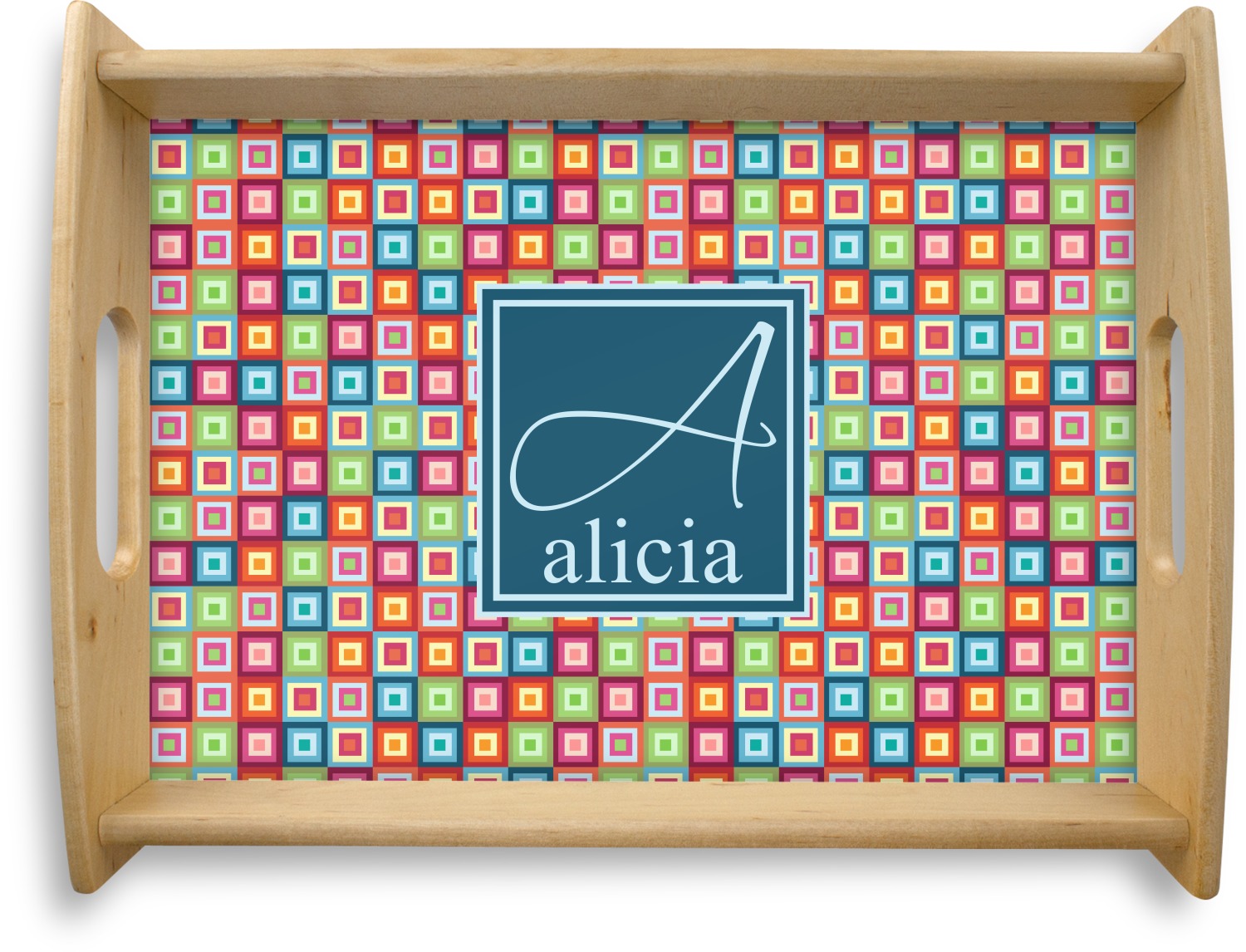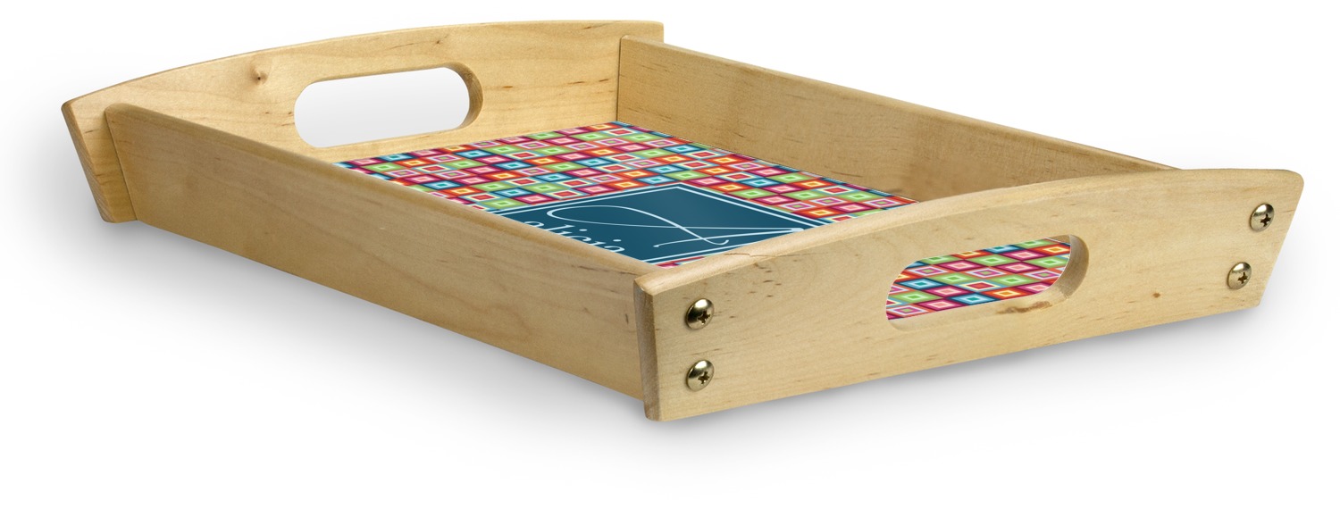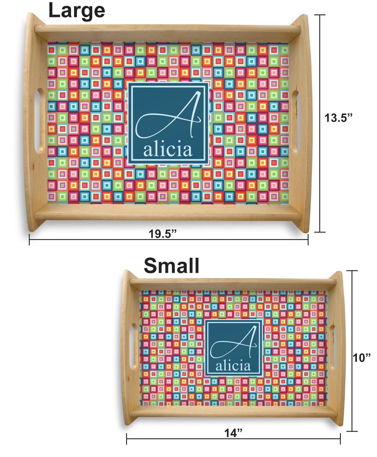 This serving tray with handles features square edges and two rounded sides, creating a very modern look. Each side is fabricated from a beautifully cut, natural wood. The bottom of the interior of the tray displays your customized design in bright, vibrant color. The tray is sold in both a black color and a natural wood look. Each variation of the wood serving tray has two sizes: Small, which is 14" x 10" x 2.25", and Large, which is 19.5" x 13.5" x 2.75".