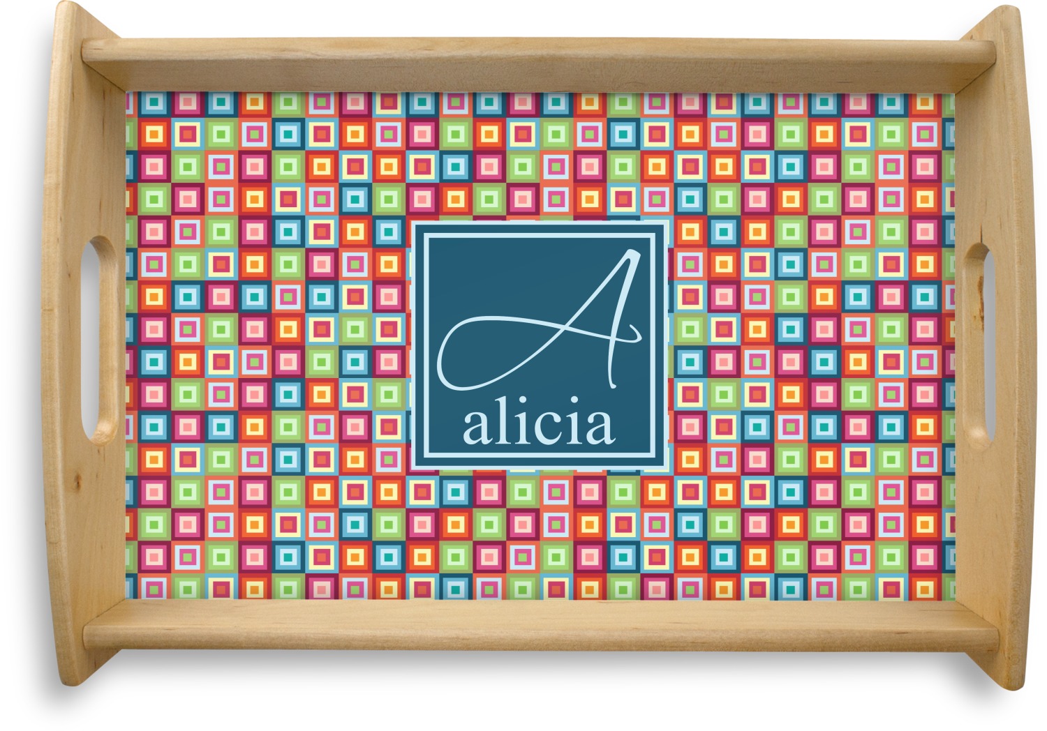 This serving tray with handles features square edges and two rounded sides, creating a very modern look. Each side is fabricated from a beautifully cut, natural wood. The bottom of the interior of the tray displays your customized design in bright, vibrant color. The tray is sold in both a black color and a natural wood look. Each variation of the wood serving tray has two sizes: Small, which is 14" x 10" x 2.25", and Large, which is 19.5" x 13.5" x 2.75".