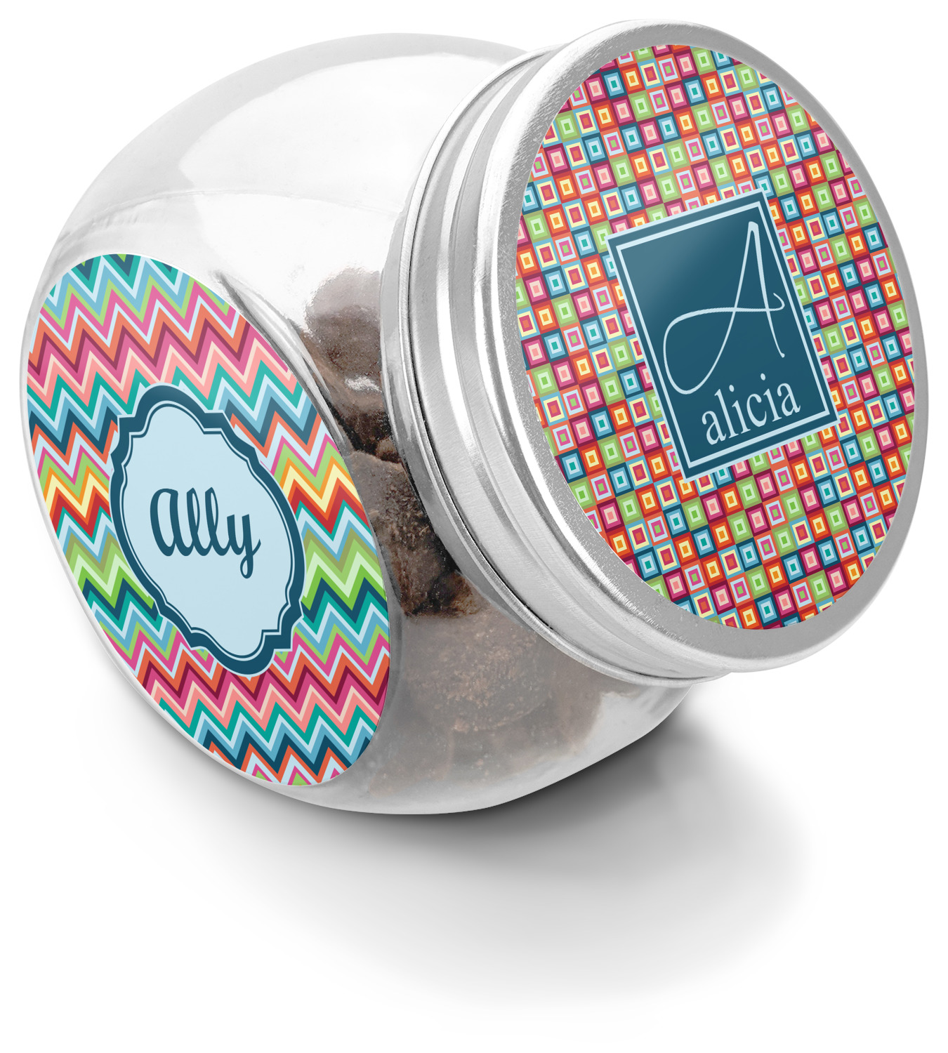 This treat jar is an excellent way to store treats for your favorite canine or feline. Moreover, their delicate, classy appearance makes them a tasteful addition to your countertop's décor. Crafted from clear glass, its unique construction and silver metal, screw-on lid allows for quick and easy access. Three, permanent, vinyl stickers are applied to both sides of the jar and lid, presenting your personalized design. The base of this glass, dog treat jar is 3.4" x 4.75", and the jar stands at 5" tall. Though on the smaller side, this jar is best suited for smaller treats or training treats.