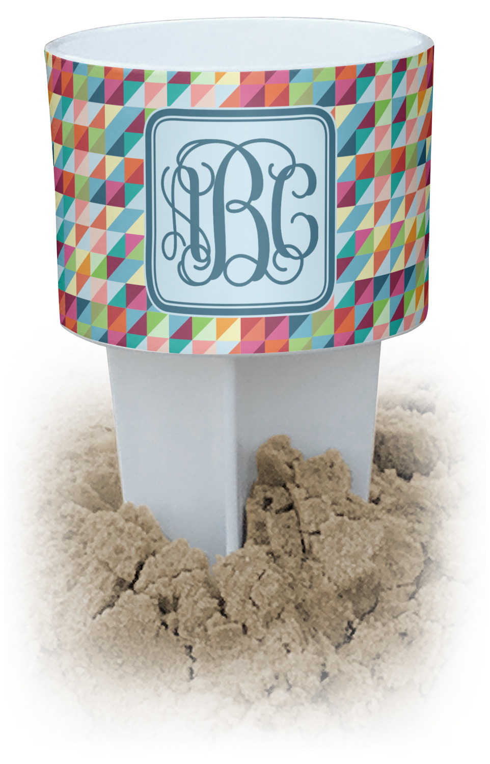 This cup holder has a large stake at its bottom that anchors it to the sand or ground below, while the cup holder rests above the stake. The entire drink holder is made of durable plastic and displays your customization around the cup holder portion. We sell these personalized beach spikers in two different colors: black and white.