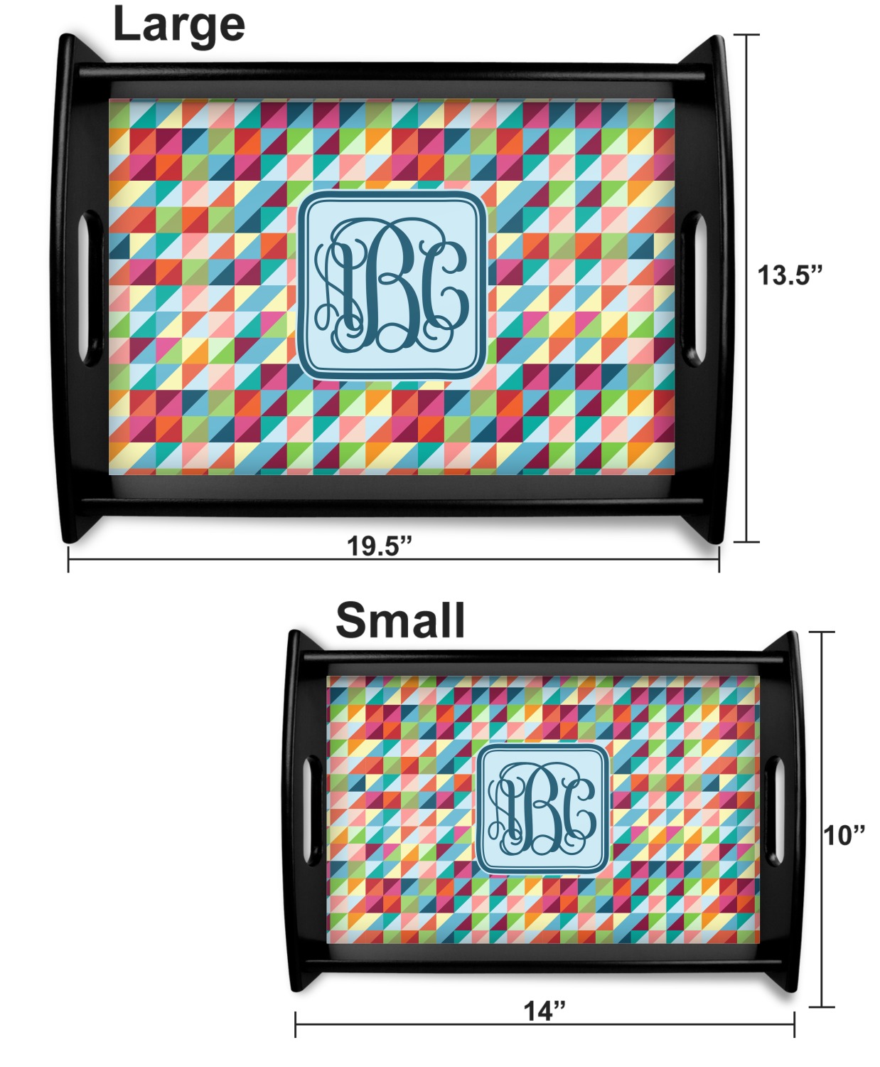 This serving tray with handles features square edges and two rounded sides, creating a very modern look. Each side is fabricated from a beautifully cut, natural wood. The bottom of the interior of the tray displays your customized design in bright, vibrant color. The tray is sold in both a black color and a natural wood look. Each variation of the wood serving tray has two sizes: Small, which is 14" x 10" x 2.25", and Large, which is 19.5" x 13.5" x 2.75".
