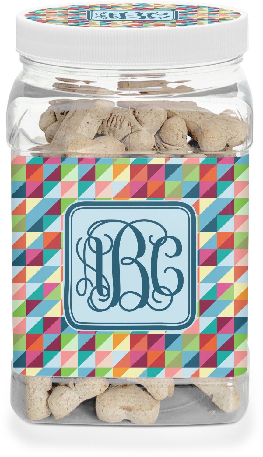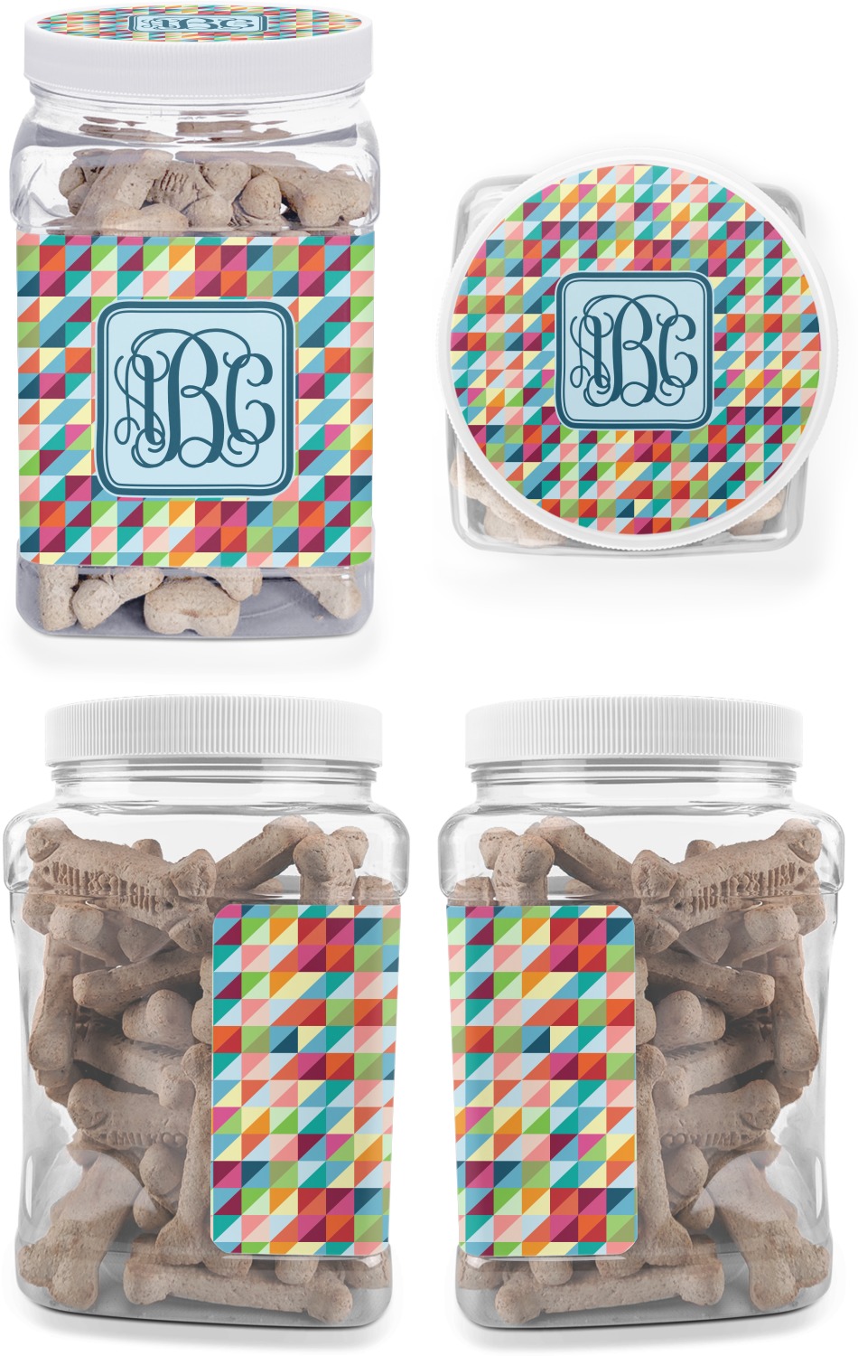 This half gallon jar, made from a sturdy plastic, is the perfect way to keep treats from any naughty pet paws, while still keeping them ready on hand for when your pup performs an impressive trick. This dog cookie jar features a screw-on, white lid that displays your personalized design on a vinyl sticker. We apply another customized sticker that wraps around the front and sides of the jar. Our dog treat jar also has indentations on the rear ends of the sides, which allows for convenient handling, and its square frame allows for easy storage.