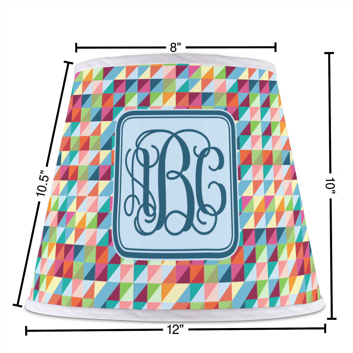 The base of this lampshade is 12 inches in diameter, and the top spans 8 inches in diameter. The total height of the lampshade is 10 inches. The angled nature of this custom lampshade concentrates the light, making it ideal for smaller spaces. This lampshade is made of matte, polyfilm, and displays your customization in its middle. The top and bottom of this colorful lamp shade are lined with a white fabric ribbon (which can be replaced with black inside the design studio) which frames your design and creates a sophisticated finish. As an UNO fitter lampshade, this unique lamp shade will fit a variety of bases.