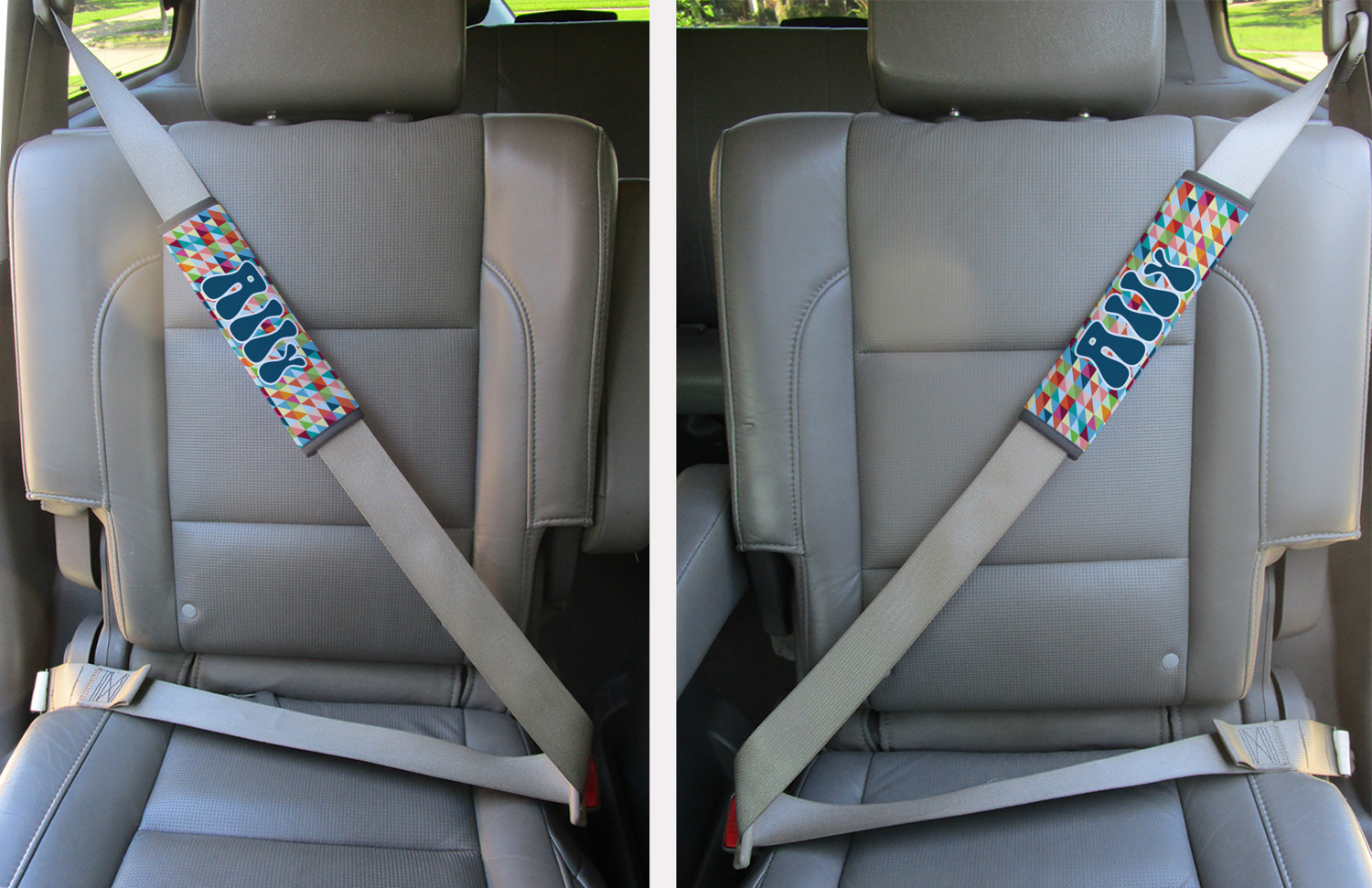 Made from neoprene, our seat belt strap covers wrap around the belt itself and have a Velcro tab for easy attachment and closure. The belt's edges are trimmed with a black polyester for a secure finish. Each cover is 9.5 by 7 inches when open and 9.5 by 2.5 inches when closed. We print your personalized design on the face of the seat belt pad.
