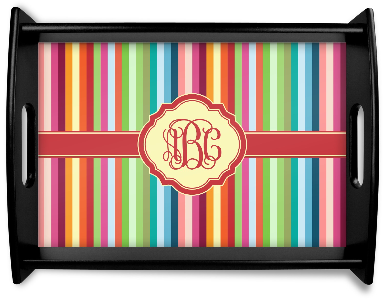 This serving tray with handles features square edges and two rounded sides, creating a very modern look. Each side is fabricated from a beautifully cut, natural wood. The bottom of the interior of the tray displays your customized design in bright, vibrant color. The tray is sold in both a black color and a natural wood look. Each variation of the wood serving tray has two sizes: Small, which is 14" x 10" x 2.25", and Large, which is 19.5" x 13.5" x 2.75".