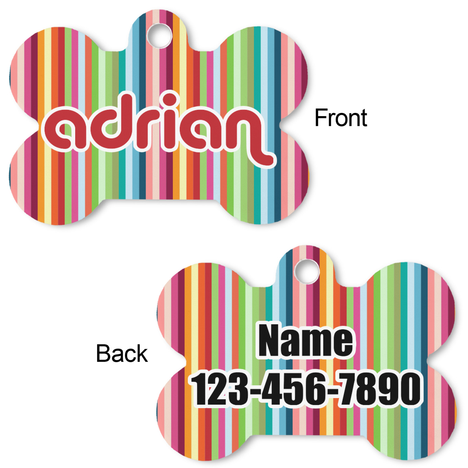 Our default design templates print your dog's personalization on the front and your contact information on the back; however everything is customizable, so you customize the patterns, the colors, the personalization, the contact information etc.