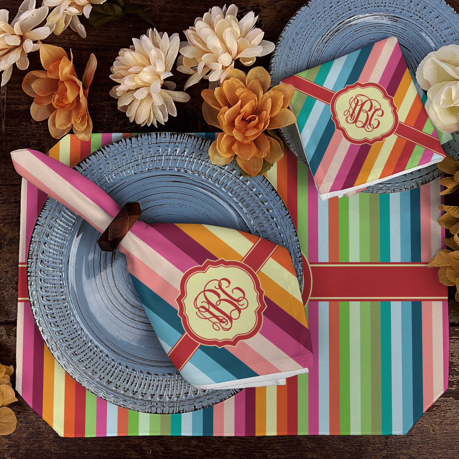 Each customizable cloth napkin is a polyester material guaranteed for long-term use. Since our napkins are cloth, it serves as a great reusable and eco-friendly dining decor. We sell personalized napkins individually or as a set of 4! Print your own unique design on all four napkins, or create four individual designs for each napkin! We offer two different napkin sizes - Cocktail napkins (approx. 10 x 10) and Dinner napkins (approx. 20 x 20). We print your design on one side, perfect for displaying your custom designed lunch napkins in any fold or table setting!