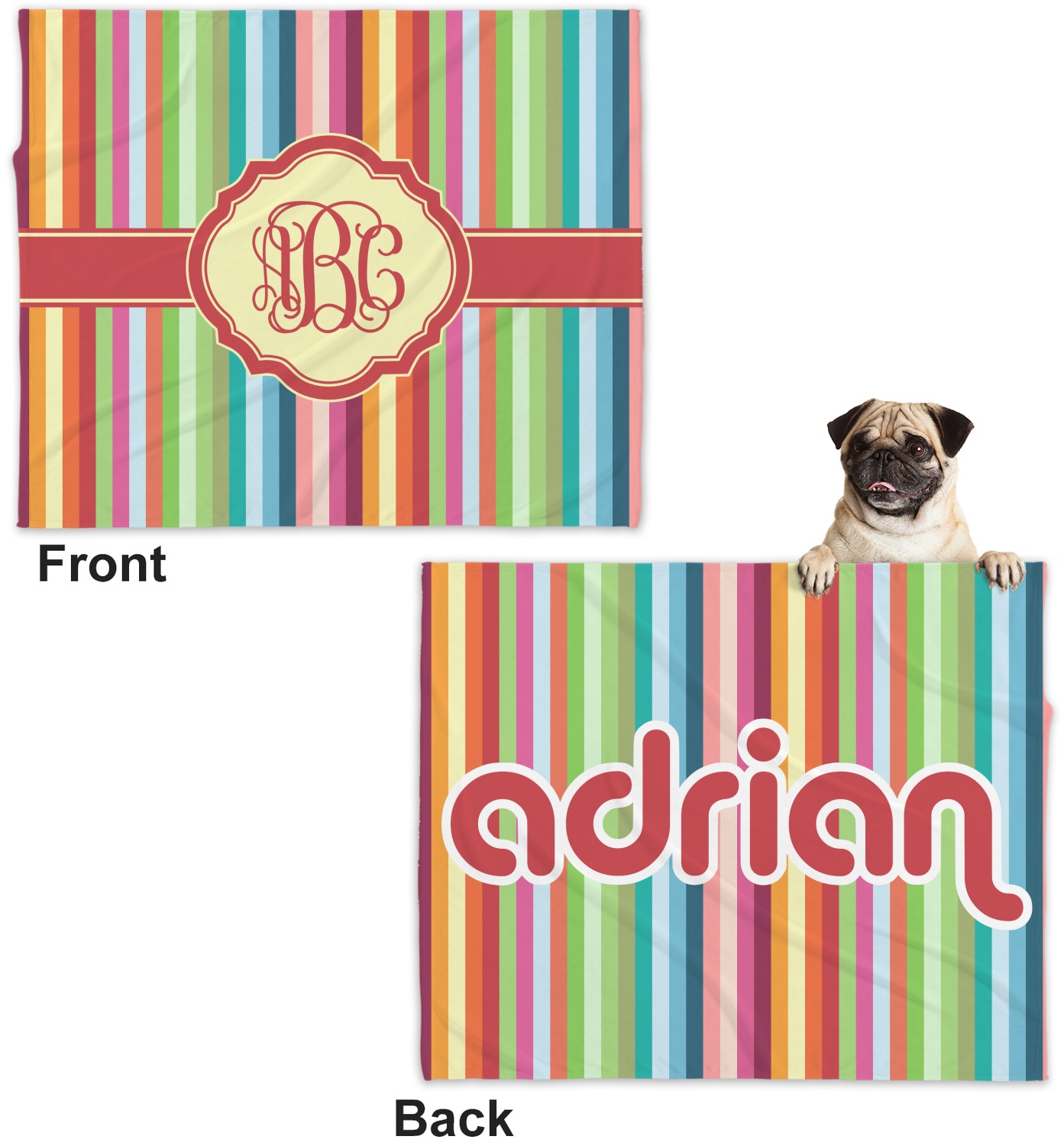 These dog blankets are crafted from a gentle, soft-to-the-touch, minky material. We print your customizations, either matching or differing, on both the top and underside of the blanket. These personalized dog blankets are available in two sizes: regular and large. Our regular size, at 40" x 30", accommodates small and some medium size dogs. At 60" x 50", our large dog blanket is a better fit for bigger breeds. Though specialized for dogs, these blankets still make a thoughtful gift for your favorite feline, or any other pet in mind!
