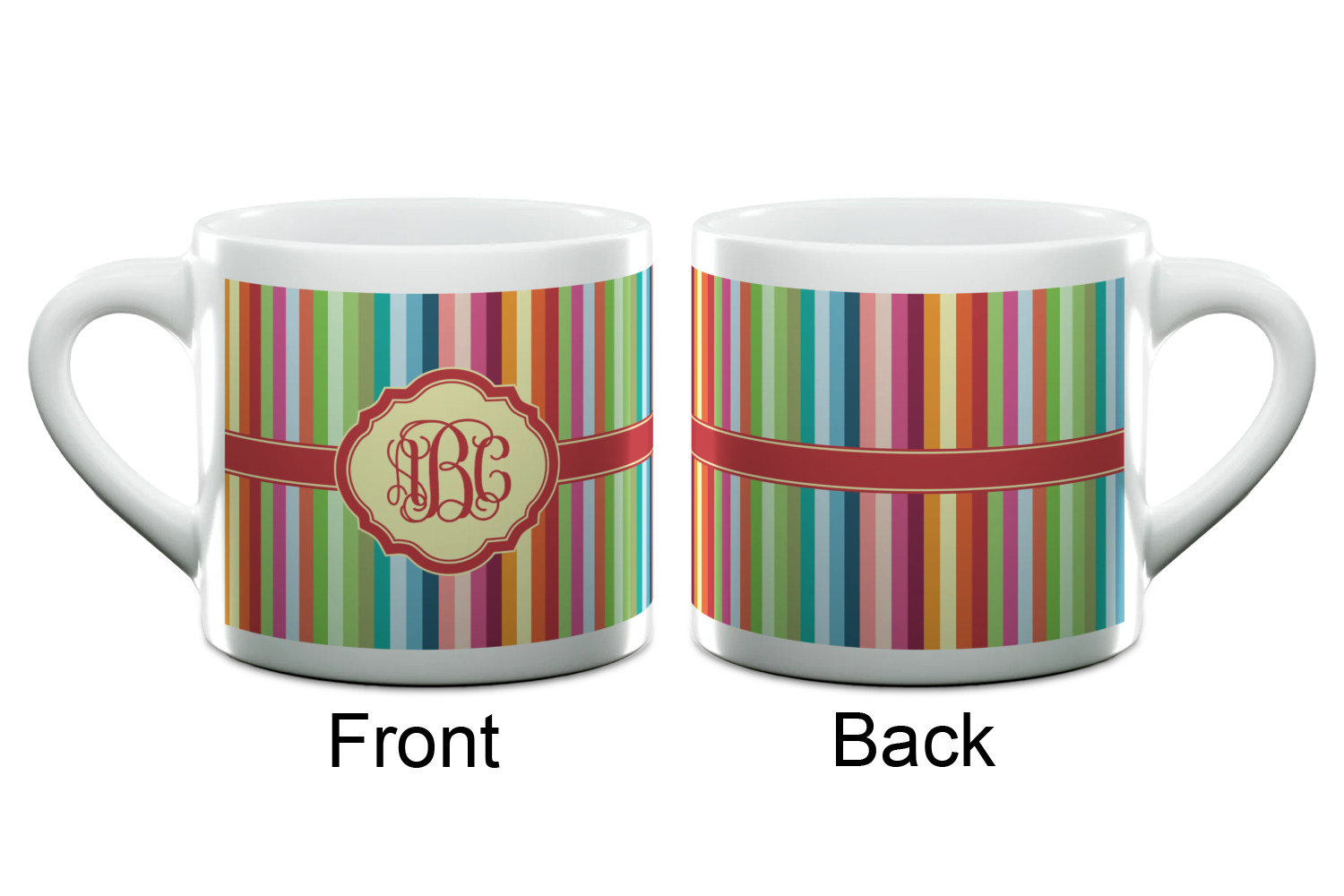 Each of our espresso mugs is a ceramic material sure to keep your drink warm. Personalize one cup for yourself, or order a set of 4! Its the perfect little gift for any coffee lover! We carry two sizes for you to personalize - 3 oz. (approx. 3.25" x 2.325" x 2.625") or 6 oz. (approx. 4" x 2.9" x 2.9"). Our 3 oz. mug is perfect for that single shot espresso while our 6 oz. mug can be your next favorite cappuccino cup holding two shots of espresso!