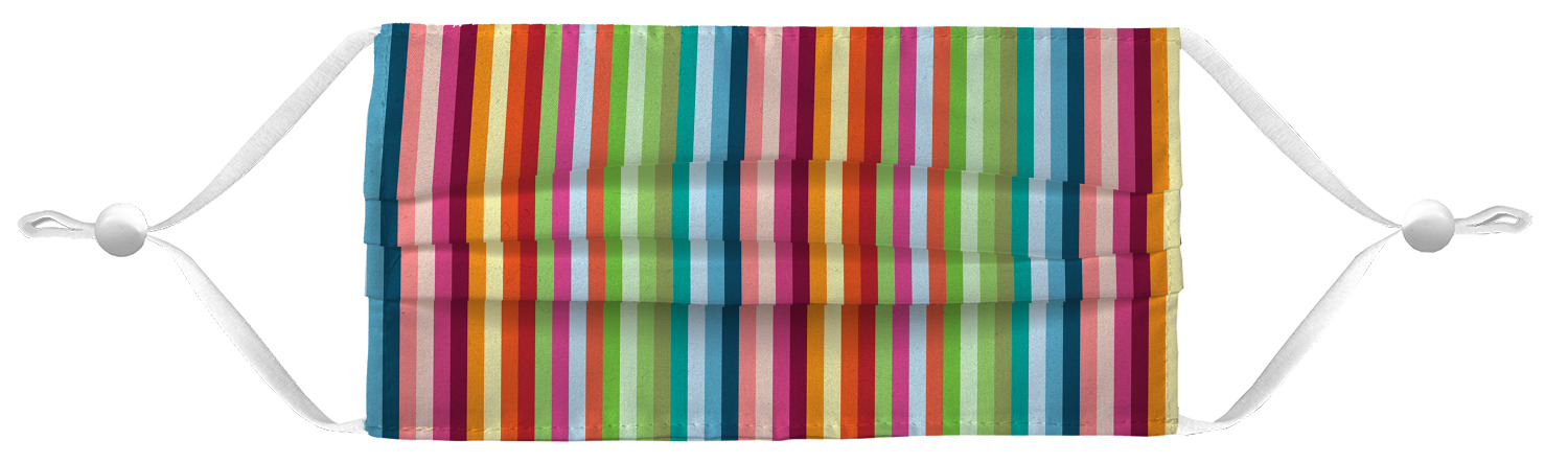 These fun face masks are 7" wide and 3.5" high. They feature pleats, adjustable ear loops, and are made with two layers of fabric. The top layer where your design is printed is a breathable polyester sheeting, while the inside layer is a soft microfiber polyester