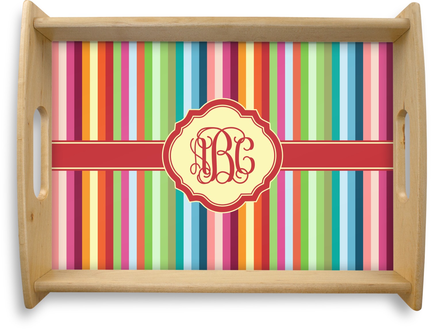 This serving tray with handles features square edges and two rounded sides, creating a very modern look. Each side is fabricated from a beautifully cut, natural wood. The bottom of the interior of the tray displays your customized design in bright, vibrant color. The tray is sold in both a black color and a natural wood look. Each variation of the wood serving tray has two sizes: Small, which is 14" x 10" x 2.25", and Large, which is 19.5" x 13.5" x 2.75".