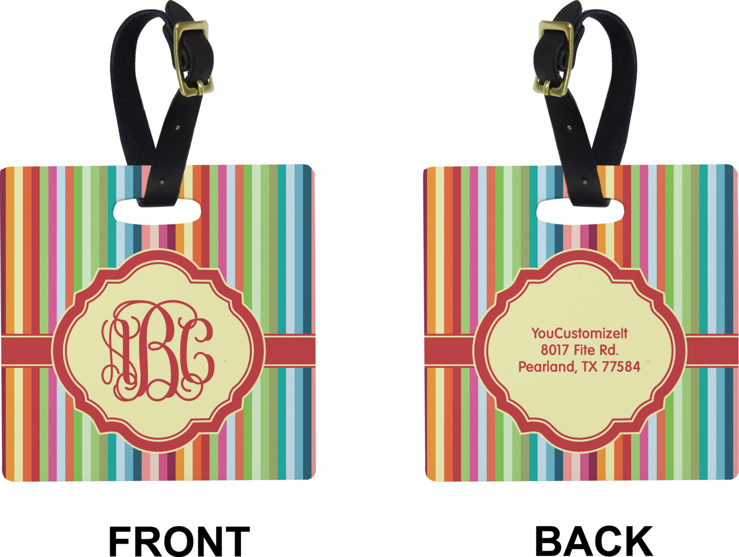 These personalized bag tags are sold in a variety of shapes, so that you may find the product that meets your vision exactly. We sell a round luggage tag, which measures at approximately 4" x 4". Our square luggage tag is about 3.5" x 3.5", while our rectangular version is 2.75" x 4 ".