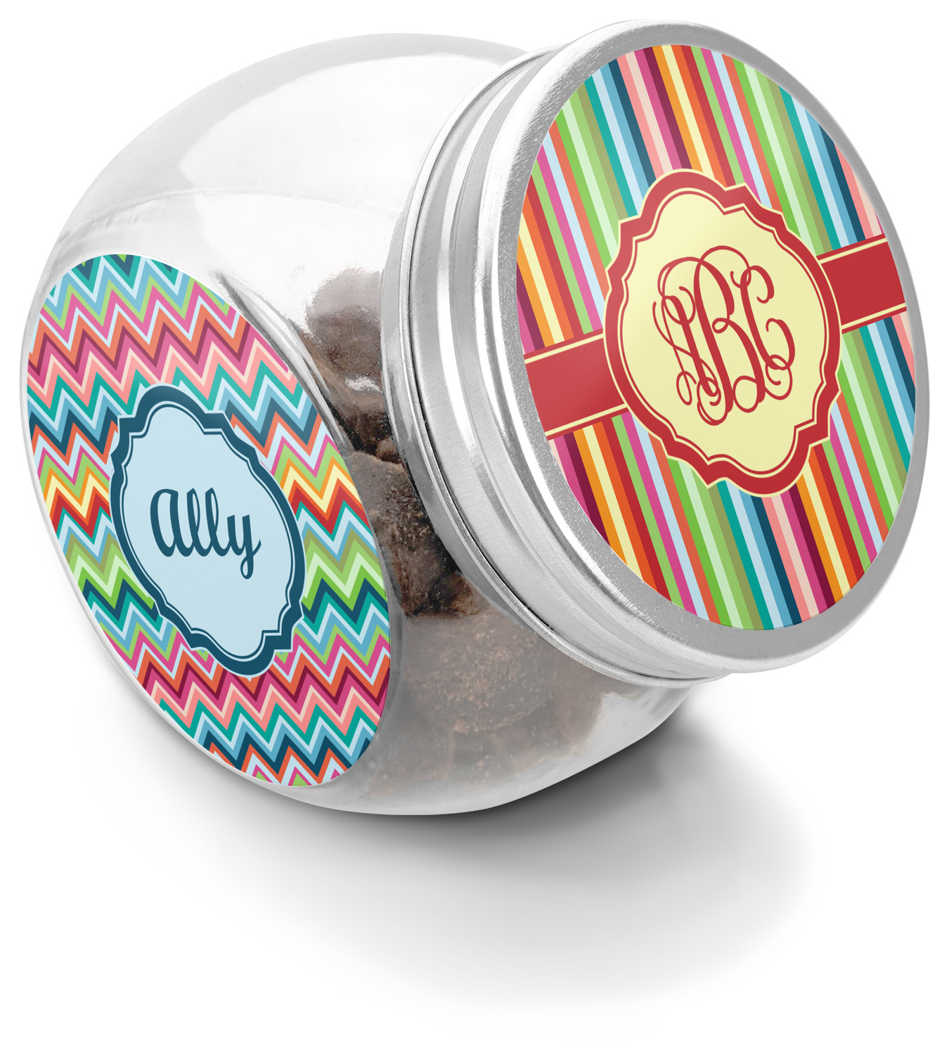This treat jar is an excellent way to store treats for your favorite canine or feline. Moreover, their delicate, classy appearance makes them a tasteful addition to your countertop's décor. Crafted from clear glass, its unique construction and silver metal, screw-on lid allows for quick and easy access. Three, permanent, vinyl stickers are applied to both sides of the jar and lid, presenting your personalized design. The base of this glass, dog treat jar is 3.4" x 4.75", and the jar stands at 5" tall. Though on the smaller side, this jar is best suited for smaller treats or training treats.