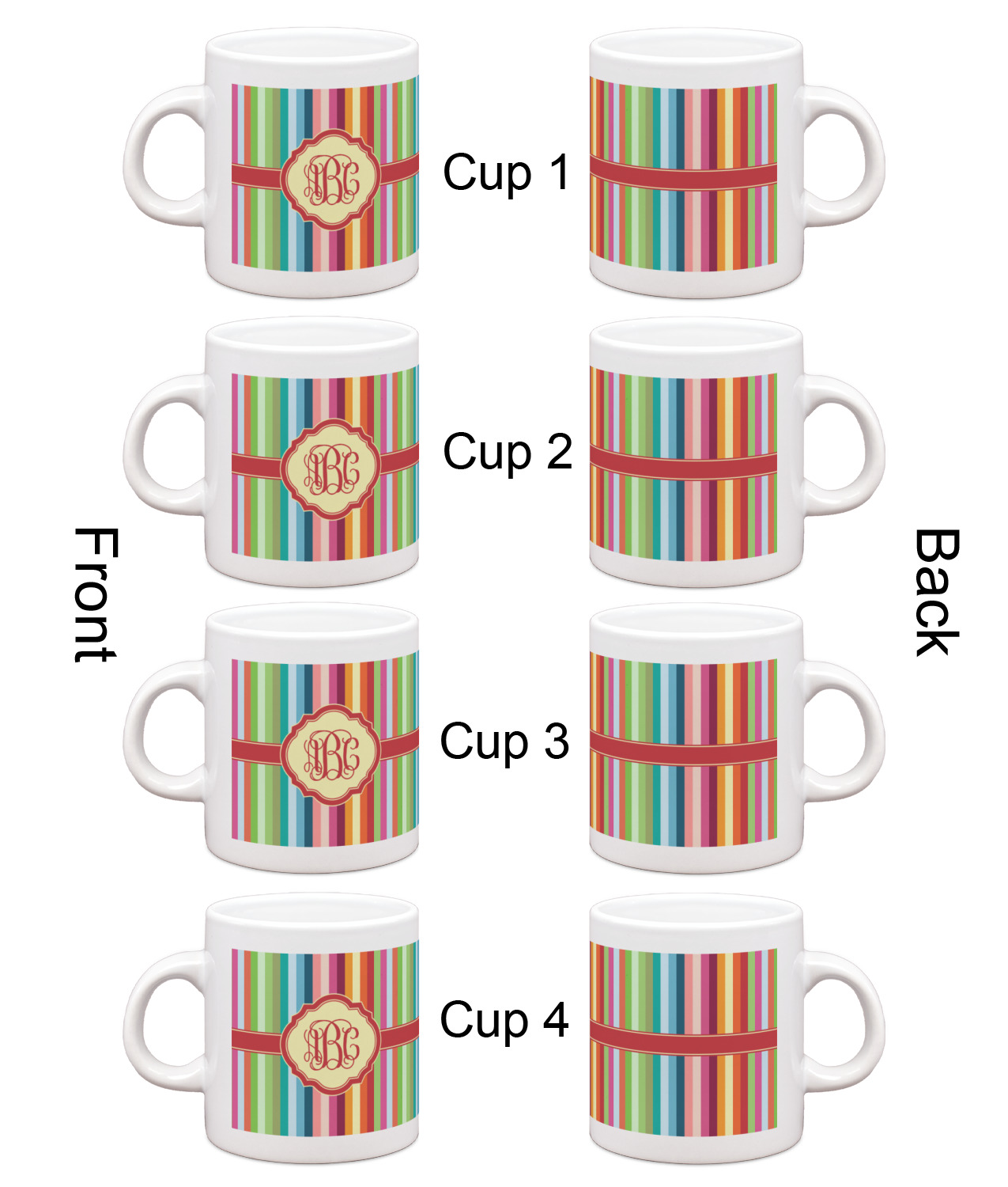 Each of our espresso mugs is a ceramic material sure to keep your drink warm. Personalize one cup for yourself, or order a set of 4! Its the perfect little gift for any coffee lover! We carry two sizes for you to personalize - 3 oz. (approx. 3.25" x 2.325" x 2.625") or 6 oz. (approx. 4" x 2.9" x 2.9"). Our 3 oz. mug is perfect for that single shot espresso while our 6 oz. mug can be your next favorite cappuccino cup holding two shots of espresso!