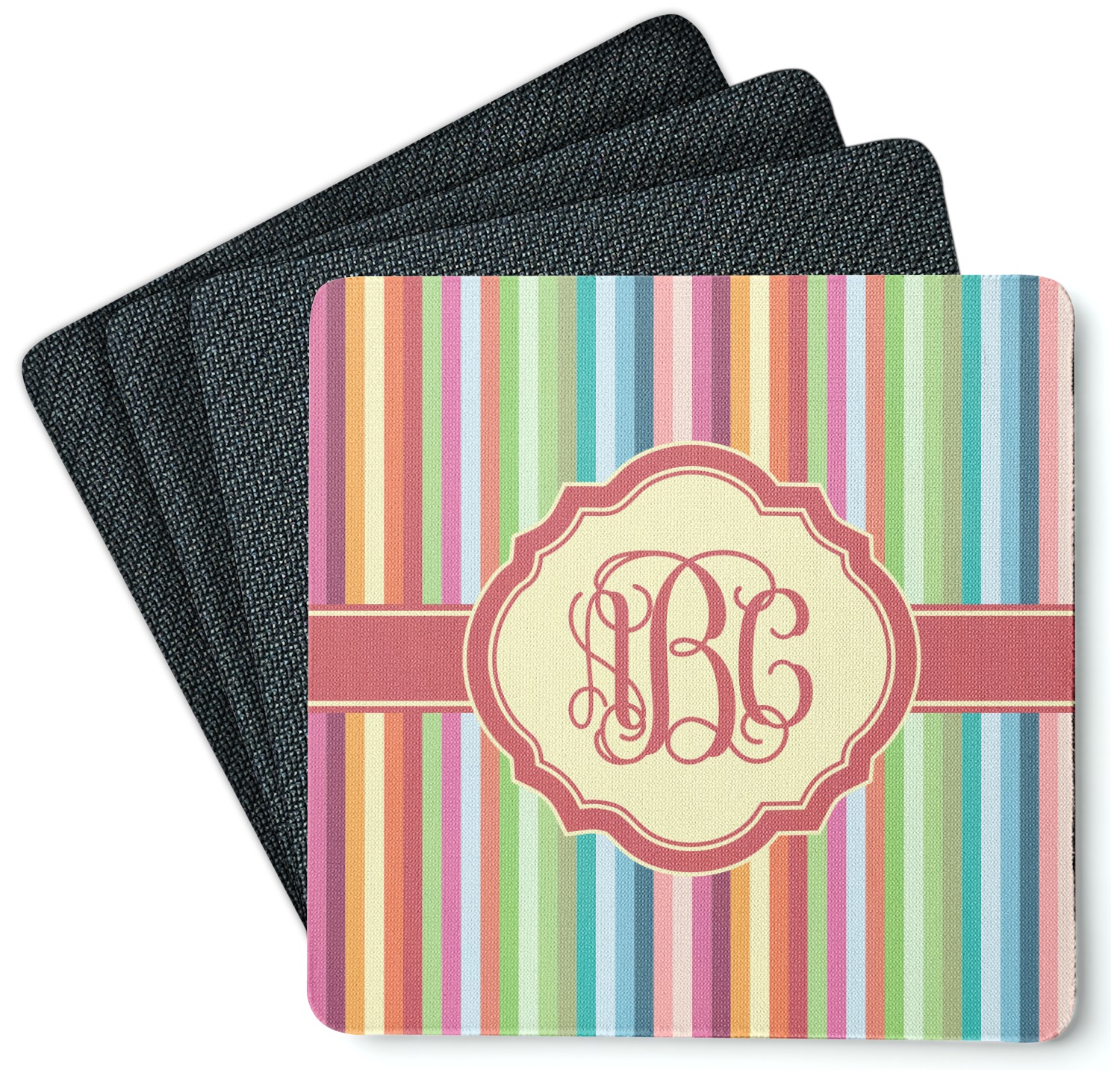 These drink coasters have a smooth, polyester top and a textured, rubber backing on its bottom. The non-slip rubber backing underneath works to keep any spills at bay. At 4 by 4 by 0.25 inches thick, these custom coasters are a suitable size for most drinkware. Your personalization is displayed atop the face of the cup coaster. We sell these rubber coasters in two different shapes: square and round. You can buy each shape as singulars or as a set of 4.