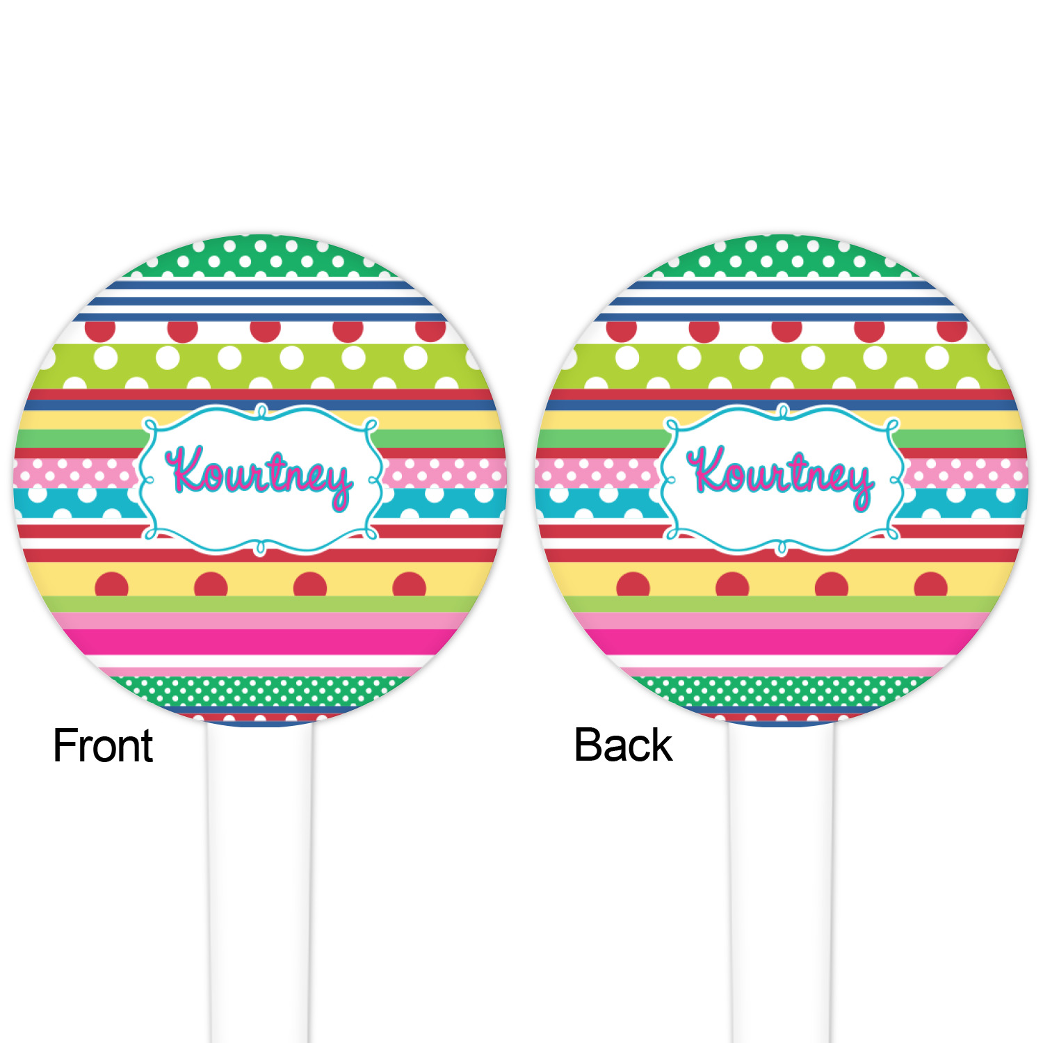 The round disc on these food & drink picks can be customized and personalized to your specifications. Your image will be printed in full color on one side or both sides. You can use the same image on both sides or use two different images.