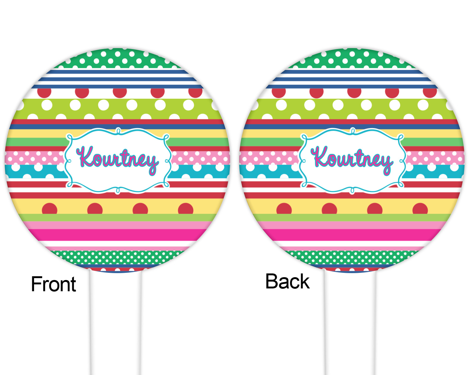 The round disc on these food & drink picks can be customized and personalized to your specifications. Your image will be printed in full color on one side or both sides. You can use the same image on both sides or use two different images.