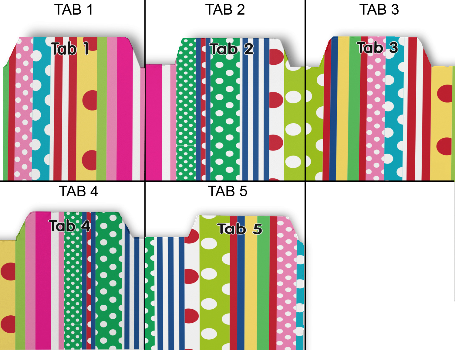 Whether you use binders at school or at work, we have designs to suit all of them. Available in 5 or 6 tab sets, you are sure to find a set to suit your needs. The back of each one is white and can be used to take notes, write vital information on, etc.