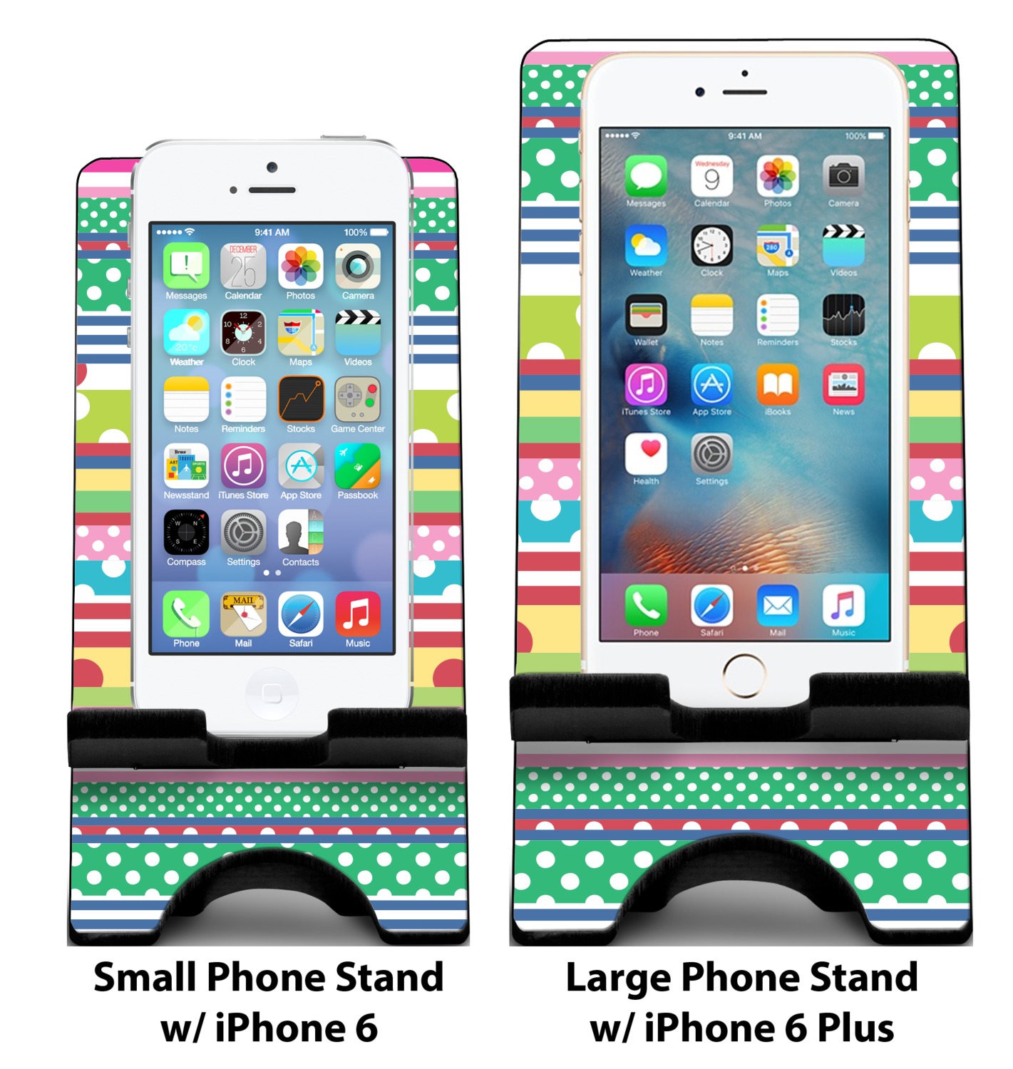 To meet your needs, we offer four variations of this IPhone stand. The backboard of the first version is shaped as a plain, yet sleek rectangle, and is available in two sizes. Our smaller size is approximately 4 by 3.25 by 7 inches, while the larger model is 4 by 3.77 by 8.5 inches. Alongside this model, we also provide you with a more decorative option. The upper part of our second version features a curved edge, for a classy, suave appearance. This phone holder is also sold in two sizes: a smaller version, which is 4 by 3.25 by 7 inches, and our larger model, which is 4 by 3.77 by 8.5 inches. Both models will support large phones, but the larger model is better if you wish to proudly display your personalized design.