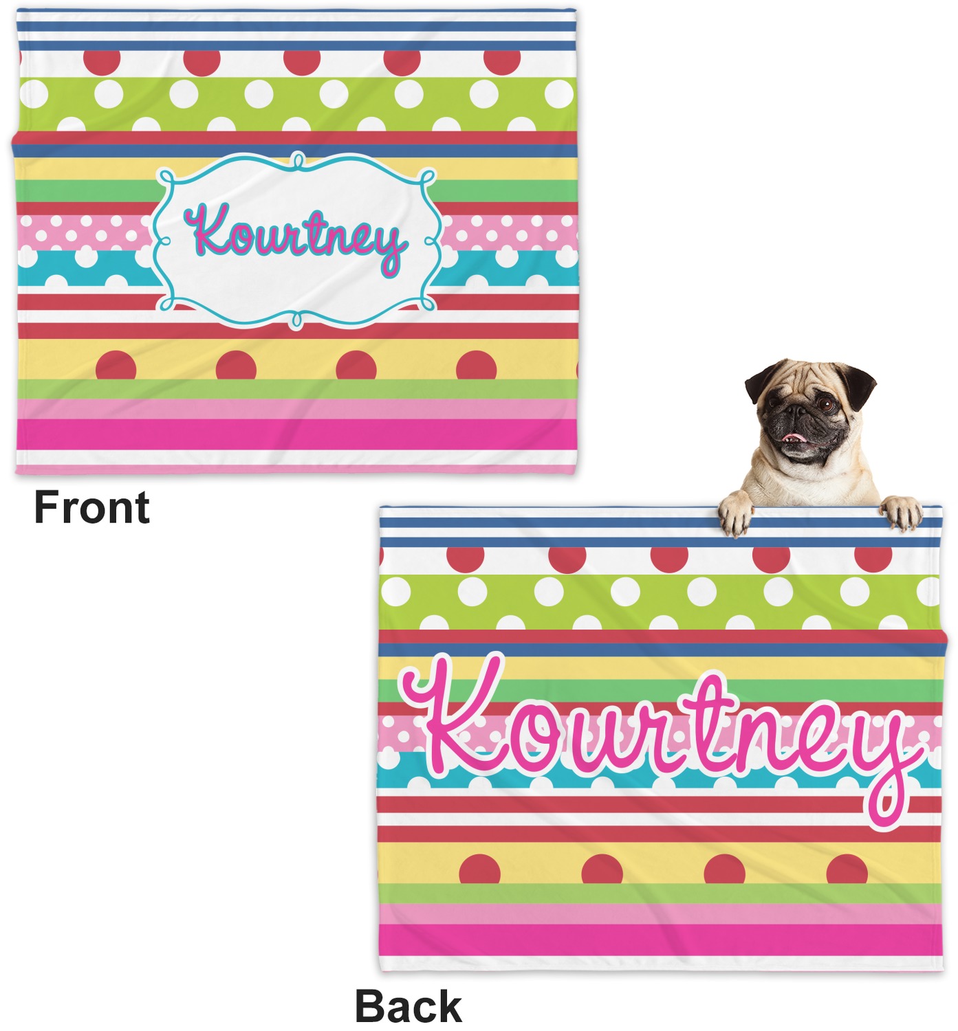These dog blankets are crafted from a gentle, soft-to-the-touch, minky material. We print your customizations, either matching or differing, on both the top and underside of the blanket. These personalized dog blankets are available in two sizes: regular and large. Our regular size, at 40" x 30", accommodates small and some medium size dogs. At 60" x 50", our large dog blanket is a better fit for bigger breeds. Though specialized for dogs, these blankets still make a thoughtful gift for your favorite feline, or any other pet in mind!