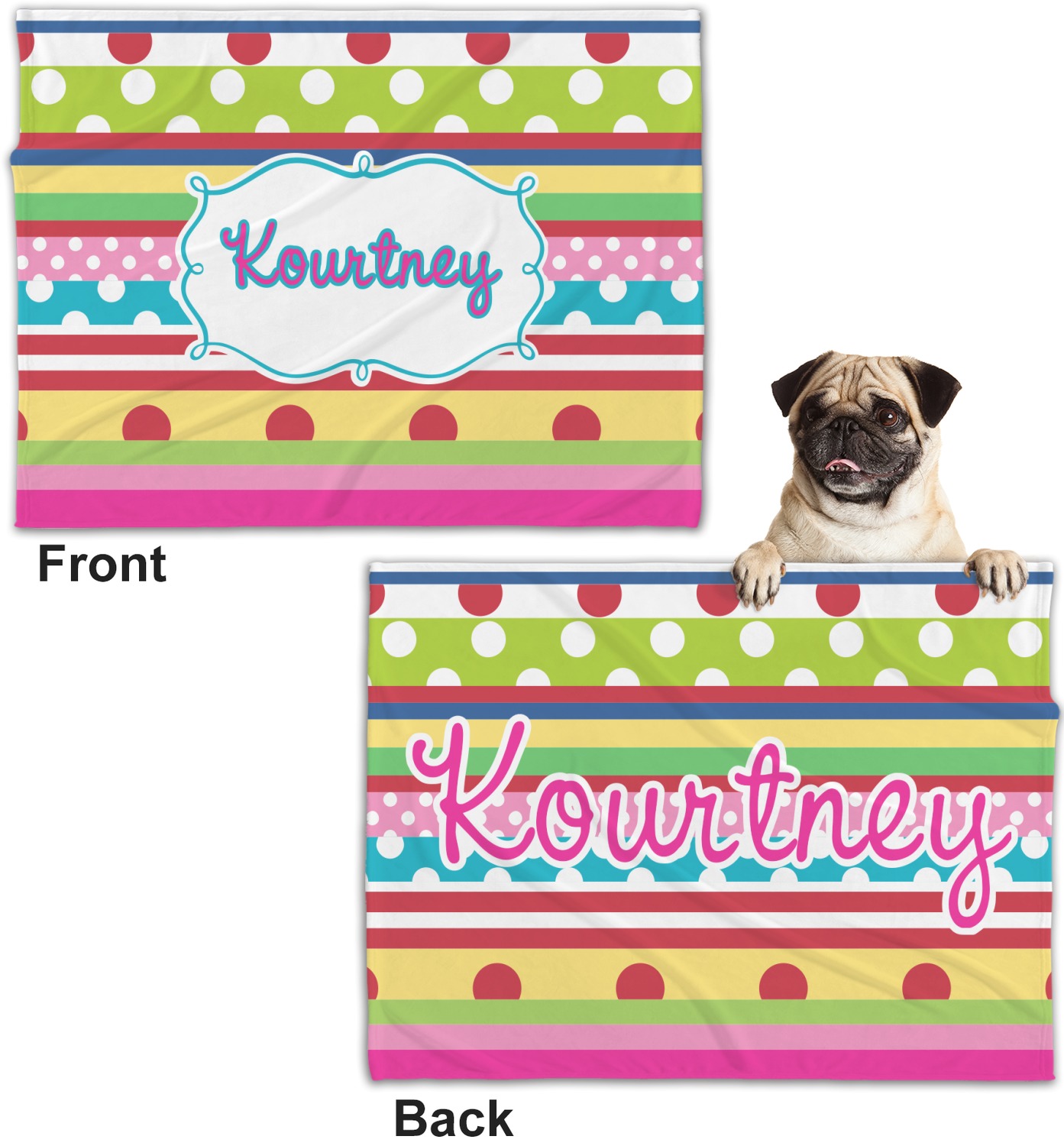 These dog blankets are crafted from a gentle, soft-to-the-touch, minky material. We print your customizations, either matching or differing, on both the top and underside of the blanket. These personalized dog blankets are available in two sizes: regular and large. Our regular size, at 40" x 30", accommodates small and some medium size dogs. At 60" x 50", our large dog blanket is a better fit for bigger breeds. Though specialized for dogs, these blankets still make a thoughtful gift for your favorite feline, or any other pet in mind!