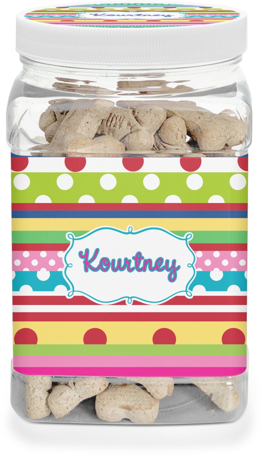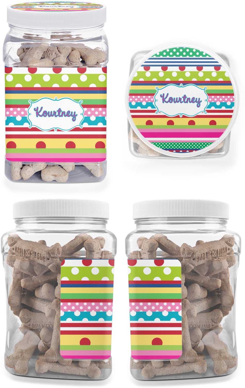 This half gallon jar, made from a sturdy plastic, is the perfect way to keep treats from any naughty pet paws, while still keeping them ready on hand for when your pup performs an impressive trick. This dog cookie jar features a screw-on, white lid that displays your personalized design on a vinyl sticker. We apply another customized sticker that wraps around the front and sides of the jar. Our dog treat jar also has indentations on the rear ends of the sides, which allows for convenient handling, and its square frame allows for easy storage.