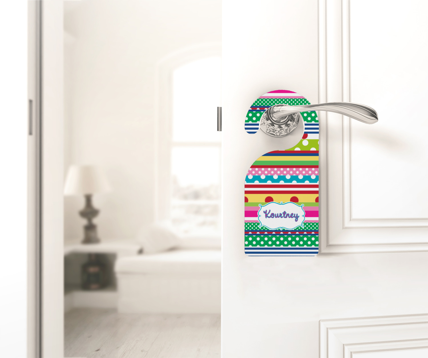 Decorate your door handles with one of our door hangers! These multi-purpose doorknob hangers can be used in a variety of situations; kids can use them to mark their rooms, parents can use them to keep privacy, and they can be used on the doors of nurseries to indicate when the baby is sleeping. Customize a few for some of the rooms in your house today! You could even give these as gifts; give one to the newlyweds in your life, or to a college student so they can use them in their dorm!