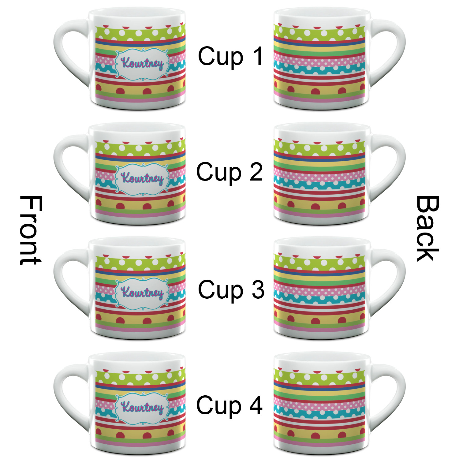Each of our espresso mugs is a ceramic material sure to keep your drink warm. Personalize one cup for yourself, or order a set of 4! Its the perfect little gift for any coffee lover! We carry two sizes for you to personalize - 3 oz. (approx. 3.25" x 2.325" x 2.625") or 6 oz. (approx. 4" x 2.9" x 2.9"). Our 3 oz. mug is perfect for that single shot espresso while our 6 oz. mug can be your next favorite cappuccino cup holding two shots of espresso!